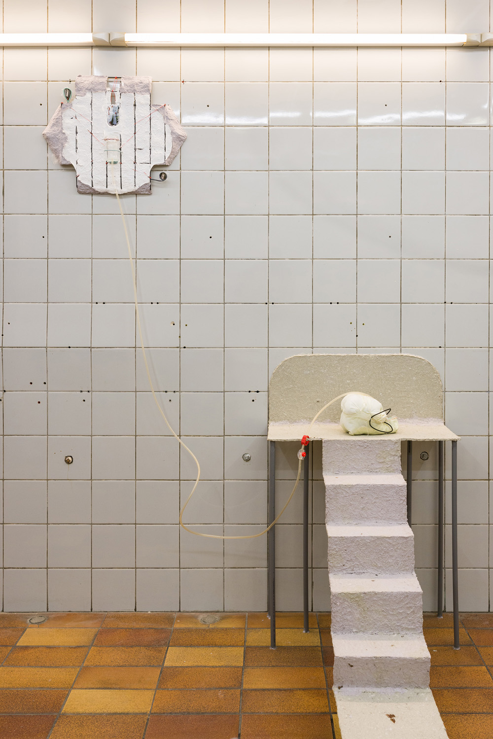 He steps off the bus with shopping bags carried over his shoulders, digging into his white windbreaker. The bags are stuffed with mixture of Aldi promotional newsletters and glass jars filled with an orange-brown semi-transparent liquid. Empty electronics boxes are taped to a simple cart. Inside the boxes, small sculptures are fastened to the interior carton walls to prevent movement and breakage. A half-step jostles one bag, which begins to ooze, leaving a smelly trail.