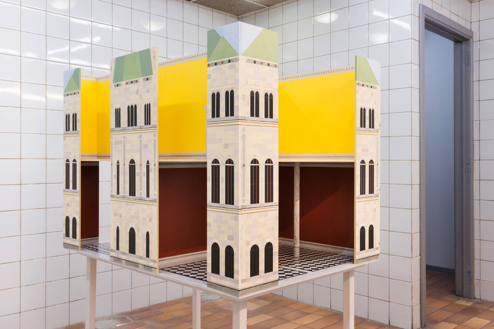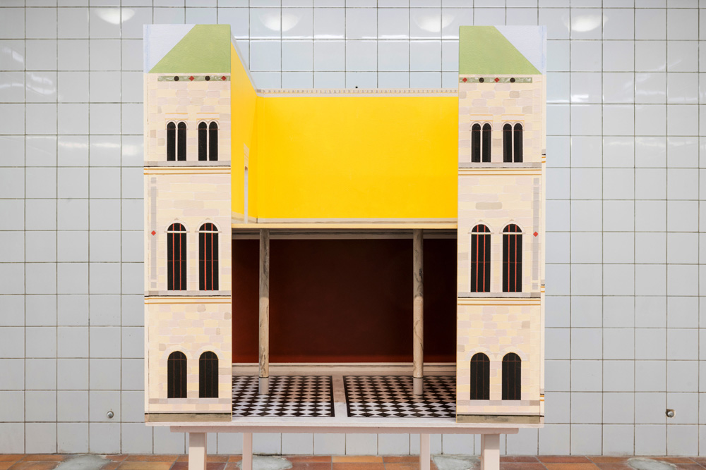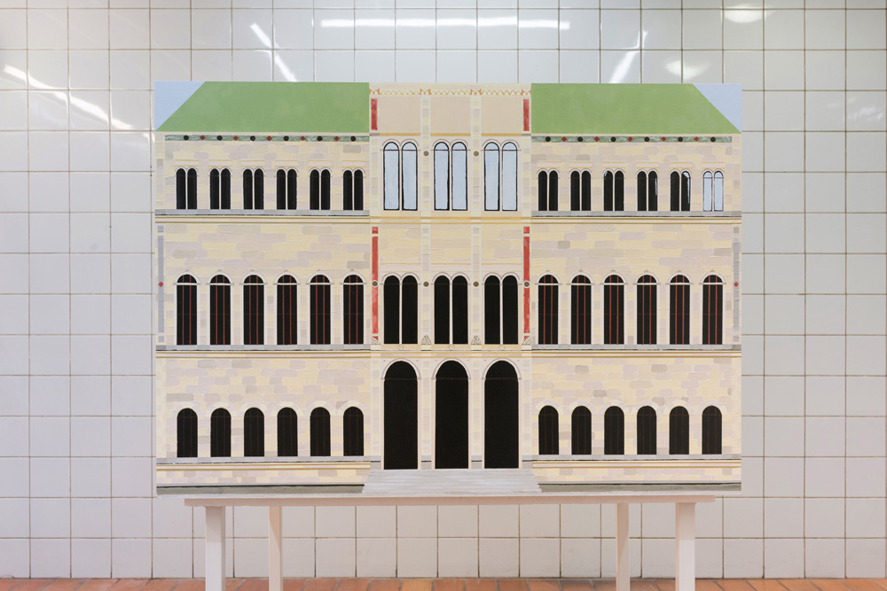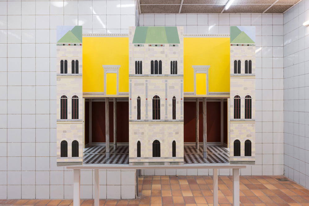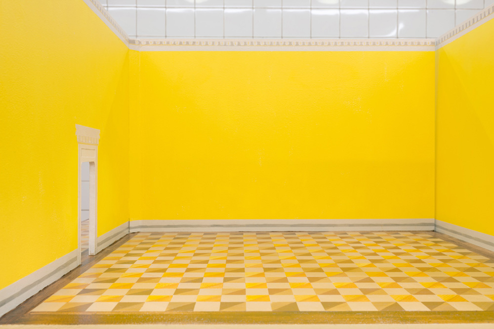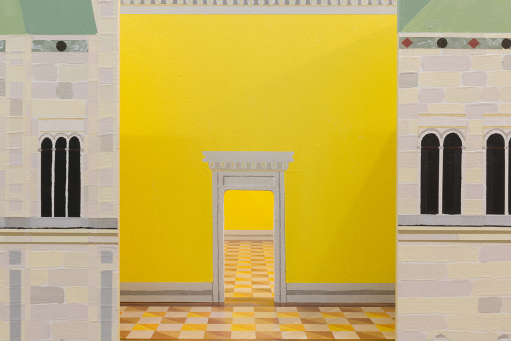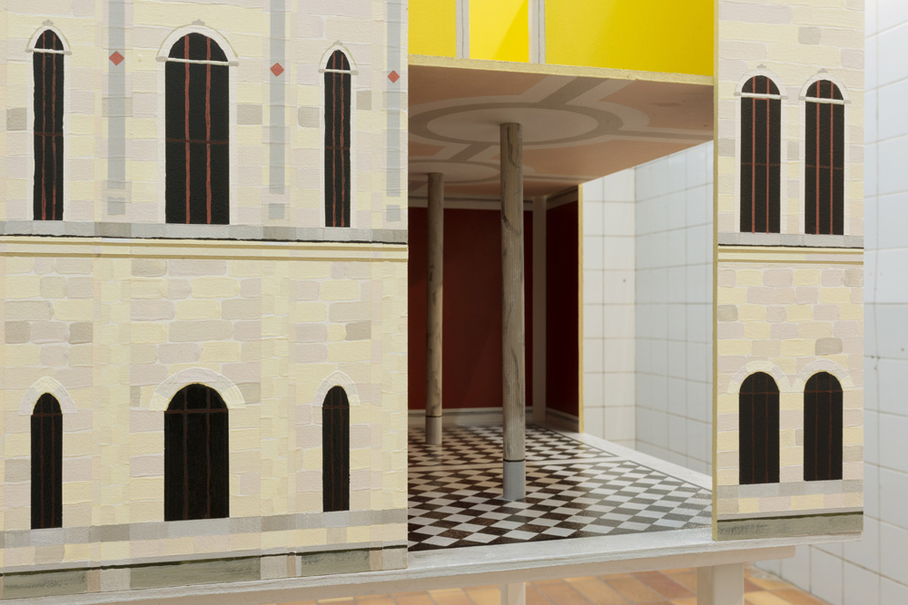 Zacharoff’s National Museum dollhouse is absent of any interior artworks or furnishings; in addition, parts of the exterior façade and roof have been removed. A series of painted planes are held together, forming the space of a museum. Light plays on detailed and finely painted surfaces. Rather than absence, there is spaciousness. The building waits for something new to arrive.