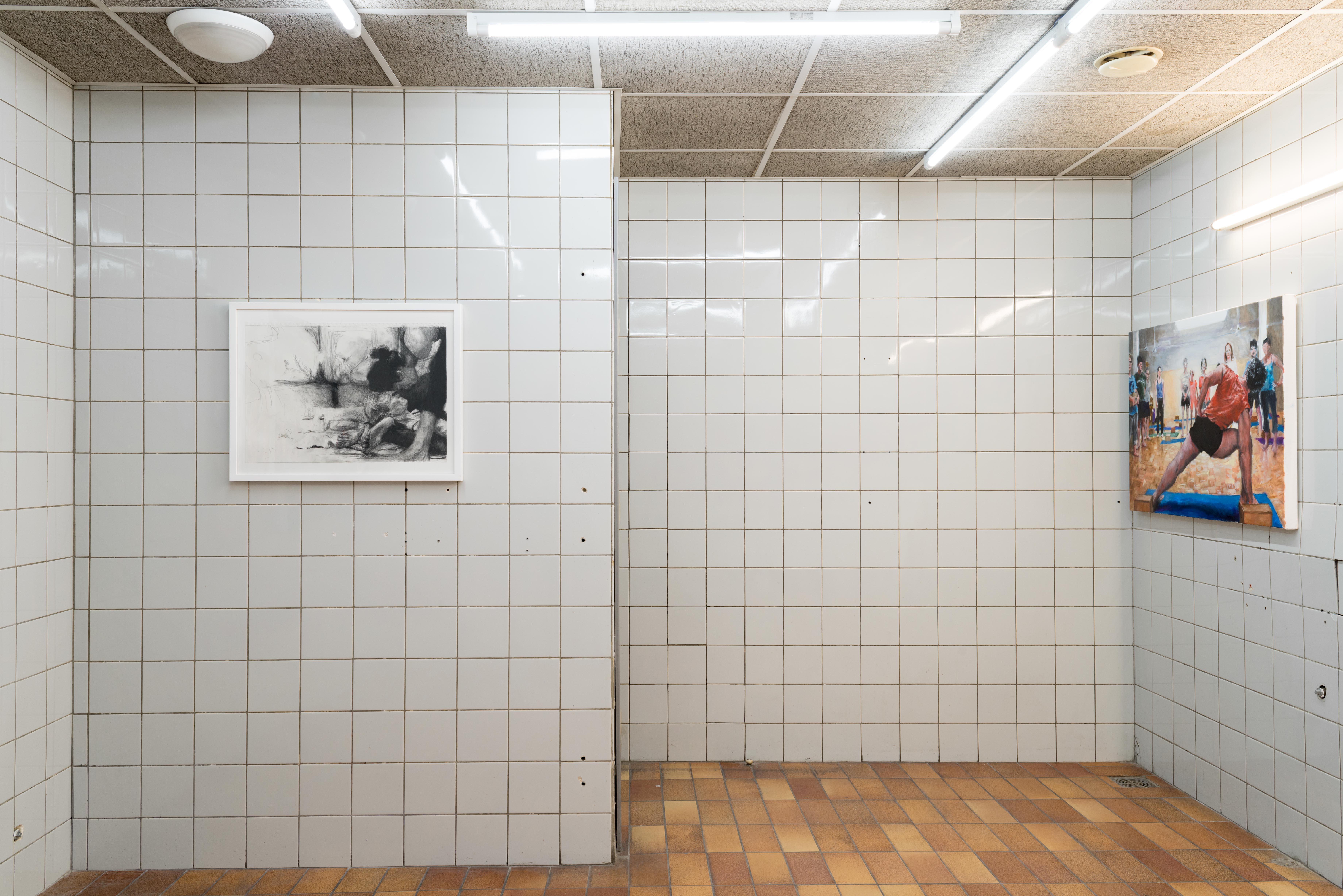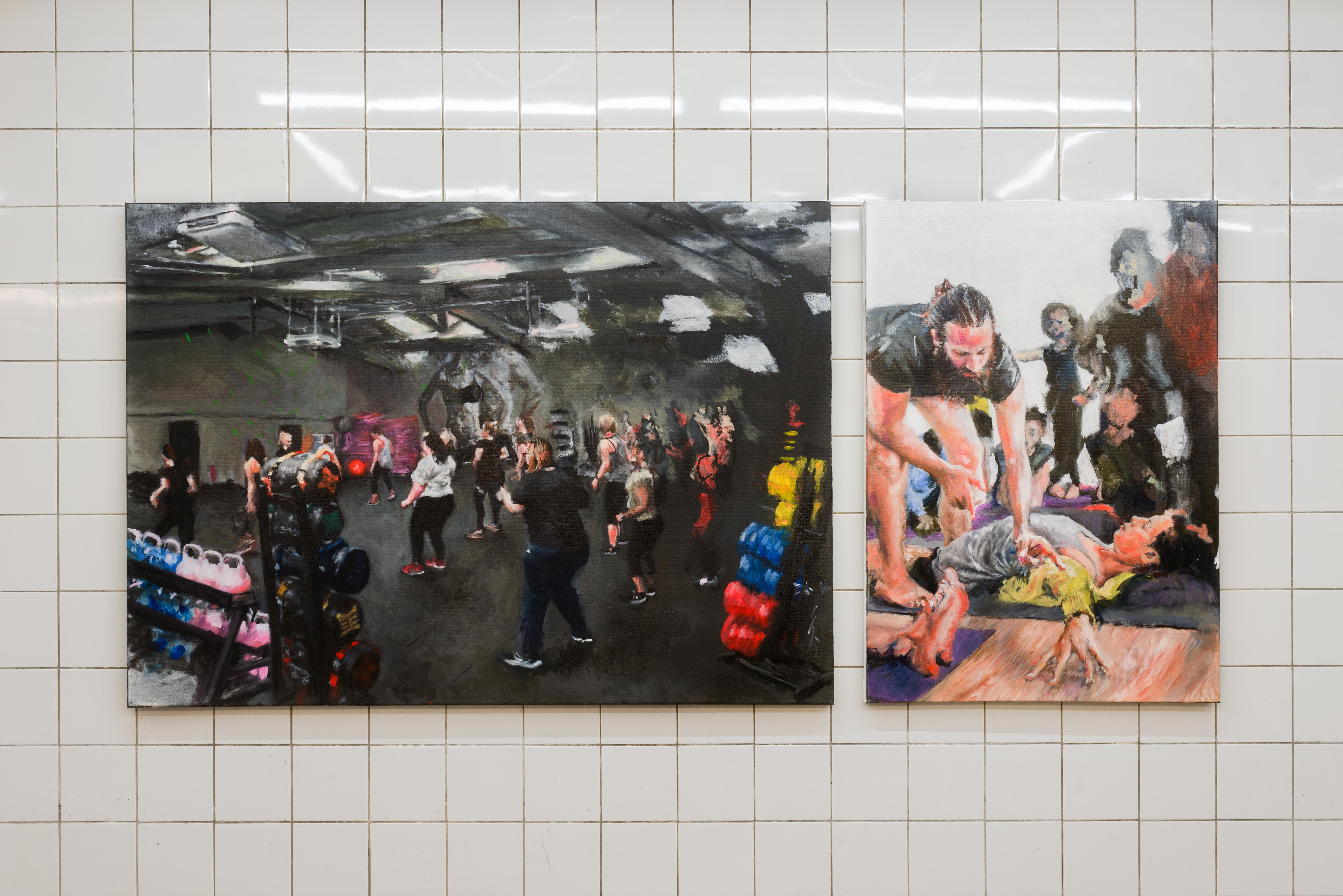Within the exhibition space of Fitness Studies, the paintings’ broken perspectives stretch and join together into a stadium or an anatomy theatre. The paintings are socialised into a group where an instructor is always present. They position us: where we look and how we move.