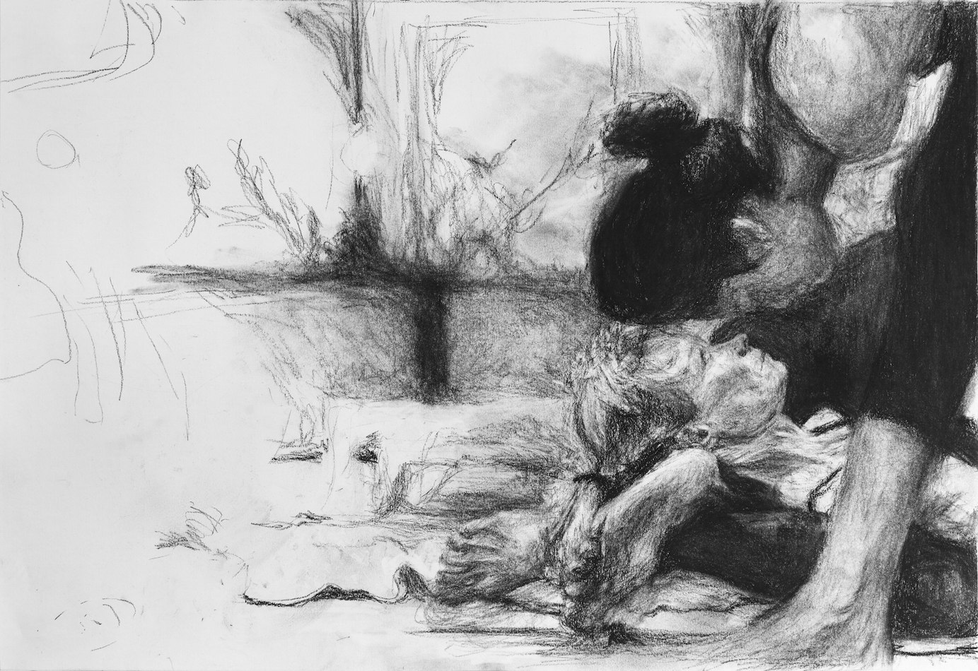 Rounded figures lie with their legs open in a similar V-form in The Land of Cockaigne by Pieter Bruegel the Elder (1567). The setting is a hill, budding with cooked food. The figures have been exercising their stomachs with a feast of sausages which grow on trees and loaves of bread that bloom like cactus. One figure’s fanned-out form emphatically delineates the bloat of the hill. He stares flatly at the sky: shavasana, corpse pose. T.J. Clark says, “Painting...seems to be best fitted to show how much of human culture and nature derives from uprightness – anatomical high standing – which the ground supports but at the same time qualifies.”