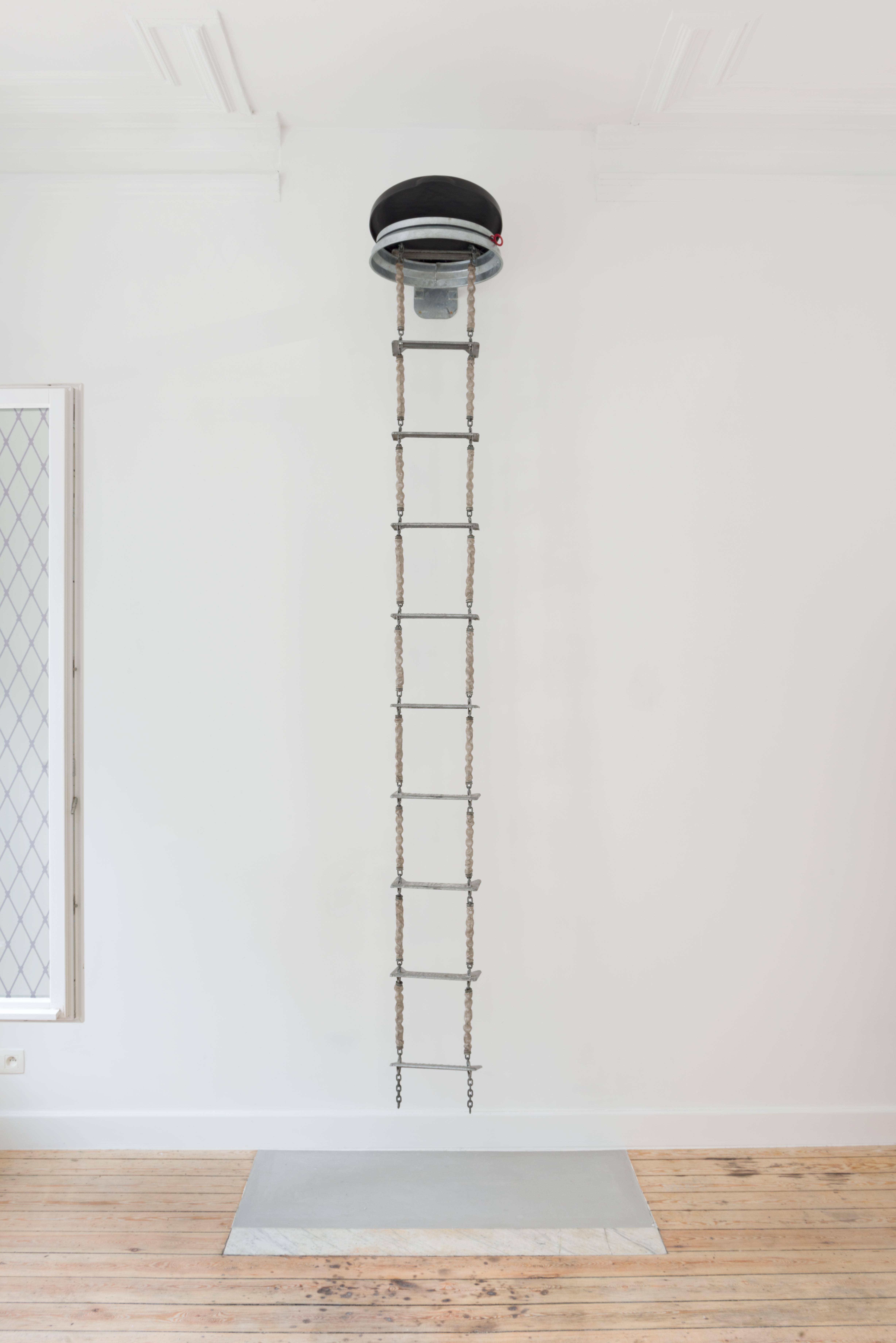 No title (2019-2020), an elongated wall-mounted sculpture, occupies the space of a former fireplace. The work is composed of an emergency escape ladder covered in aqueous cream that dangles from the lid of a garbage sack holder.