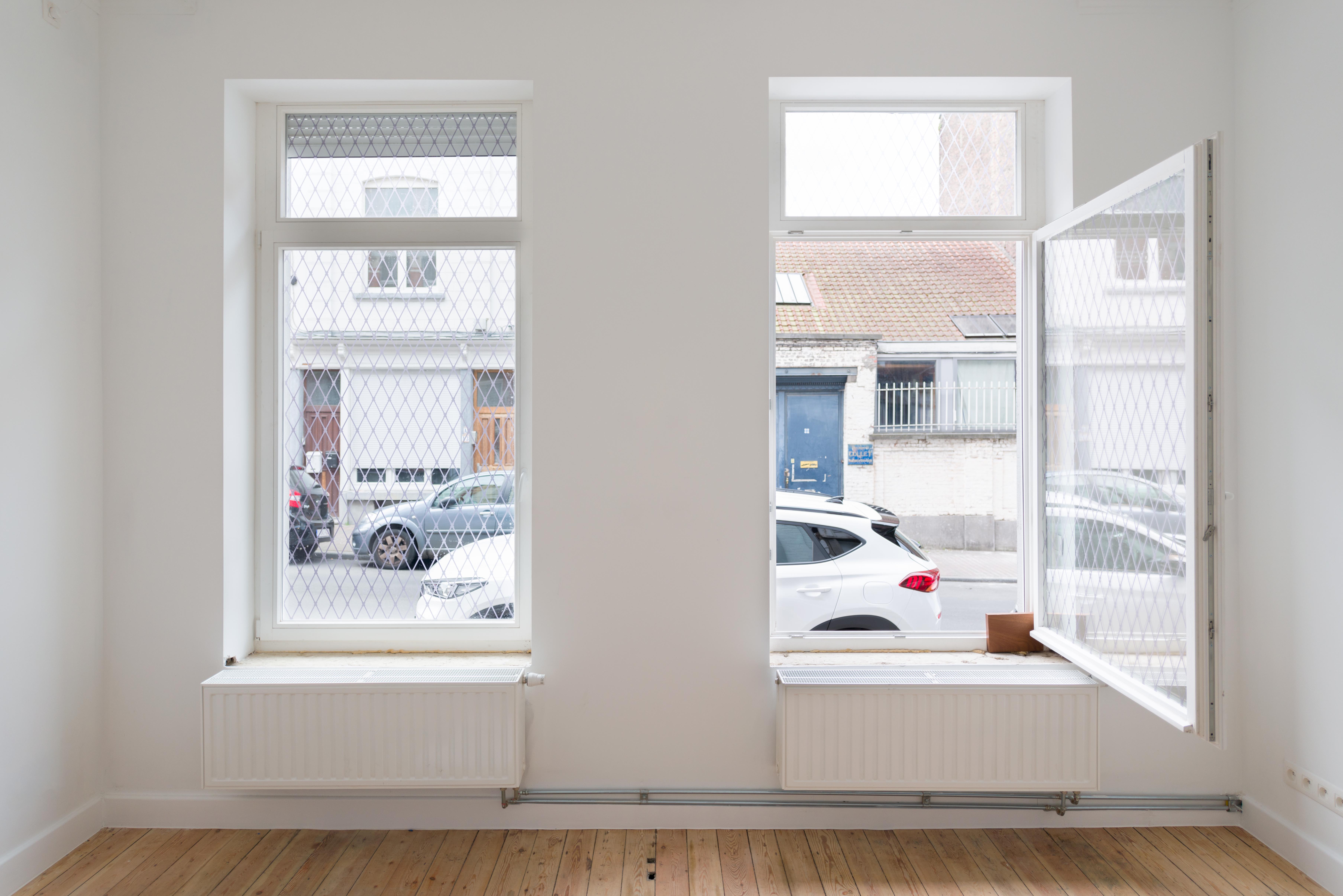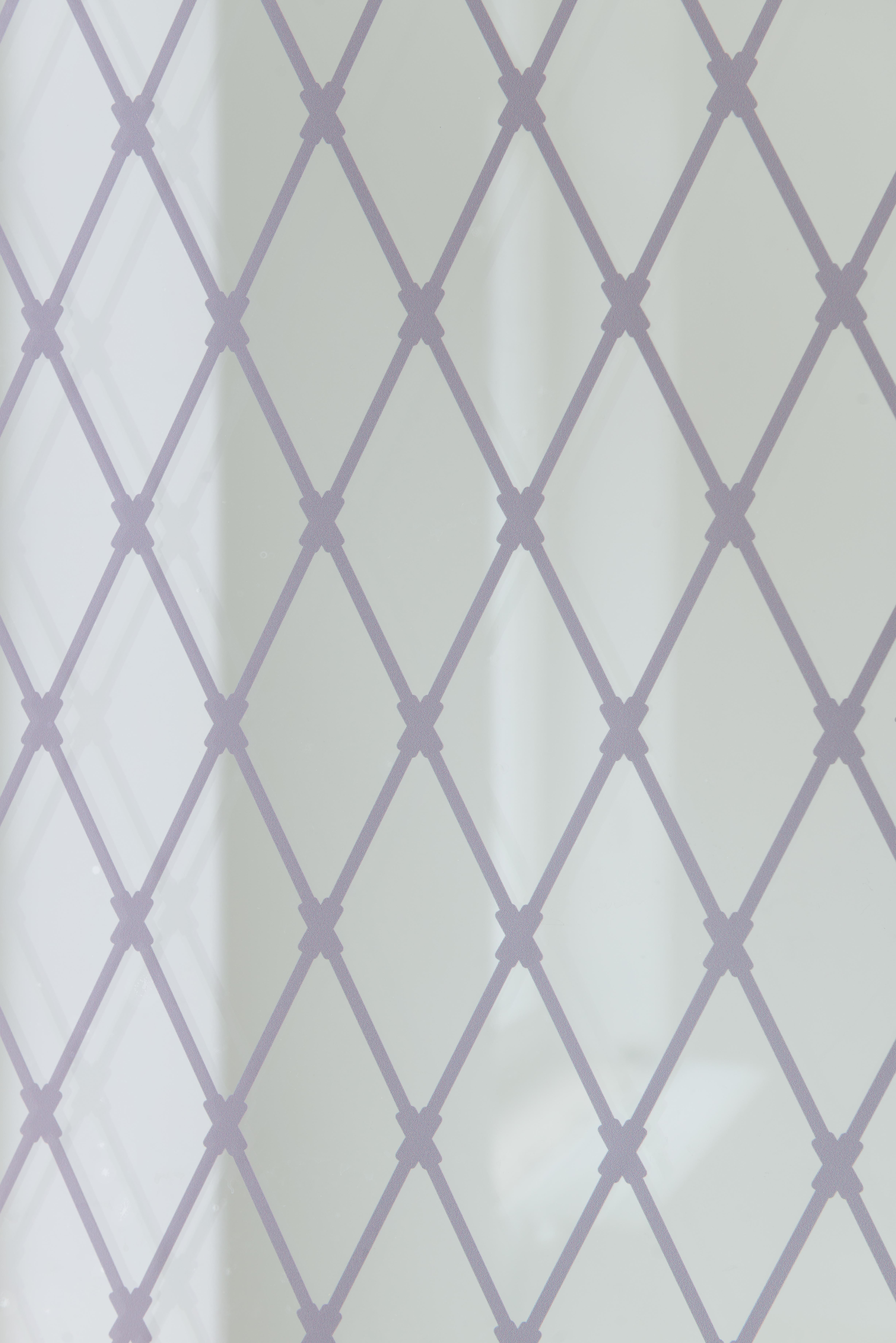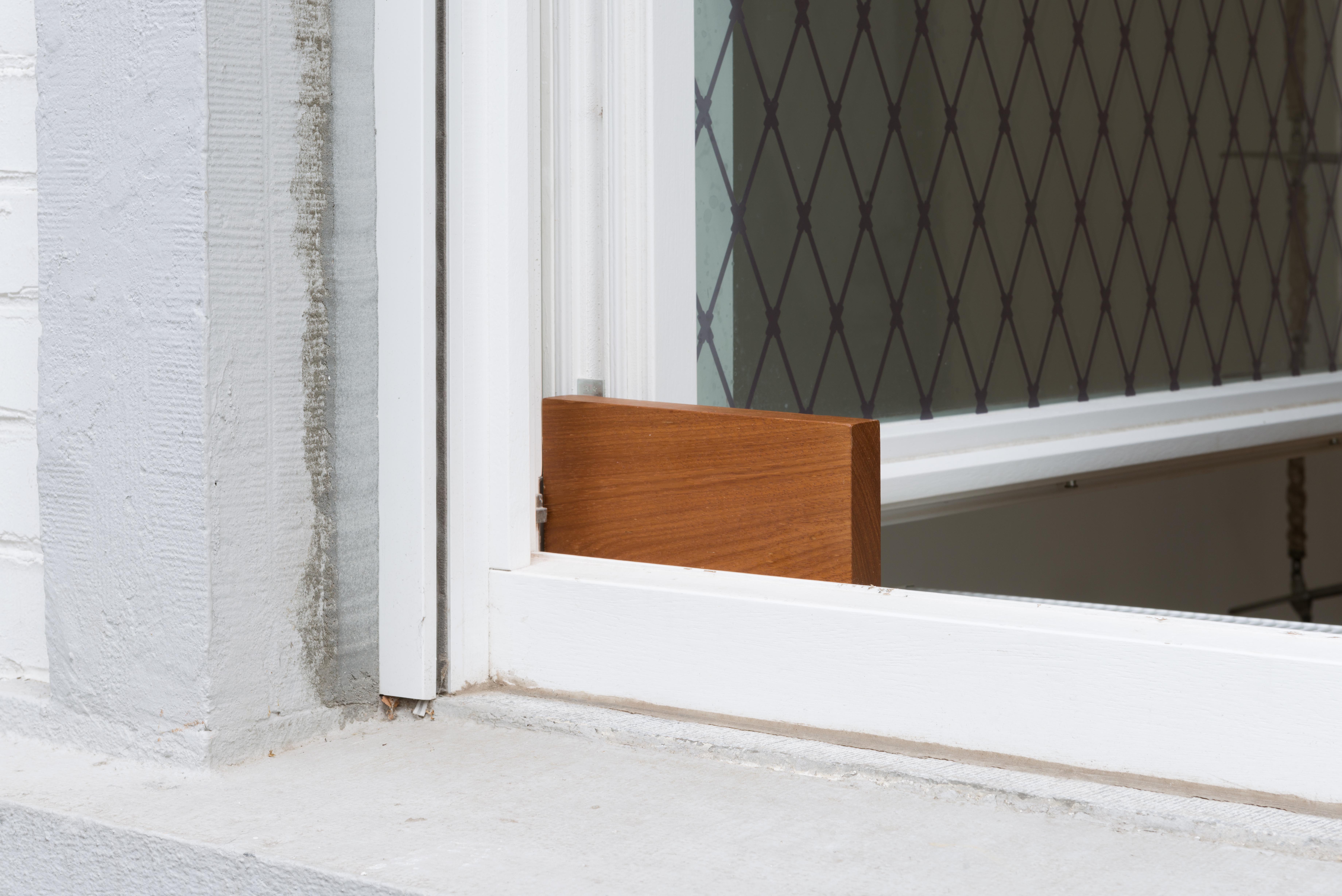 Covering the windows of Kantine is Solyx (Kantine) (2022). SOLYX® Bird Safety Film is designed to deter birds from flying into reflective glass, thus suffering an injury or death. The film forms a fence-like pattern over the windows. Solyx (Kantine) (2022) is interrupted by a second work No title (2022) a block of Iroko hardwood which props open the gallery window.
