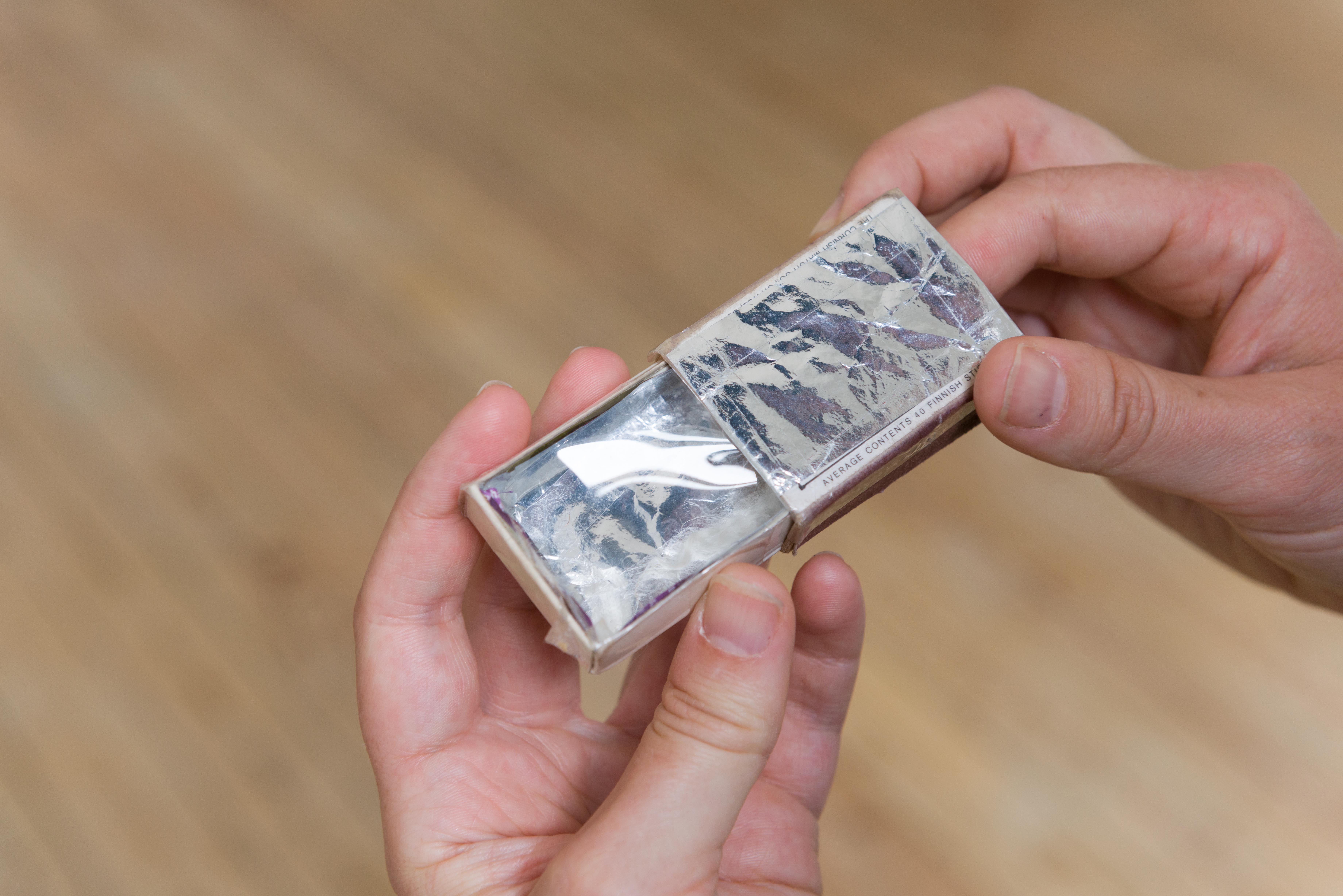 The title of the exhibition Abe bi rebewu a na ɛsɔ is a Ghanian proverb meaning ‘it is when some palm trees are about to die that they give good wine.’ Palm wine, a ritual drink in West African countries, is taken up by Adi as the main ingredient within a homespun film developer recipe. It appears in the exhibition as a publication Palm Wine Developer Recipe for Motion Picture Film, (2022) which contains Adi’s uniquely formulated recipe translated into the three main languages spoken in Brussels: French, Dutch and English. The publication is available for sale, offsite, at rile* books, and also as a PDF on our website. Additionally, the palm wine developer was used to produce a small film negative held within another matchbook-sized work, Whiskey (2022).