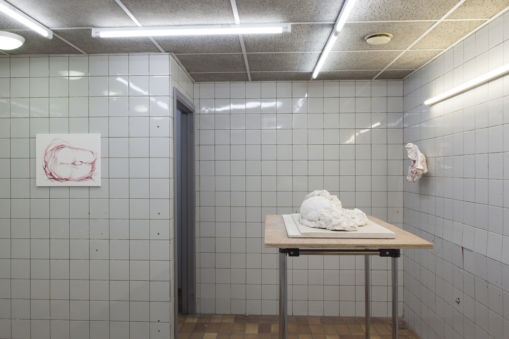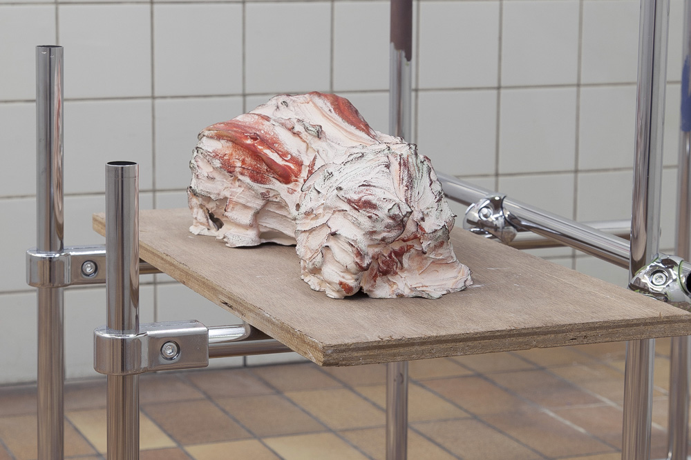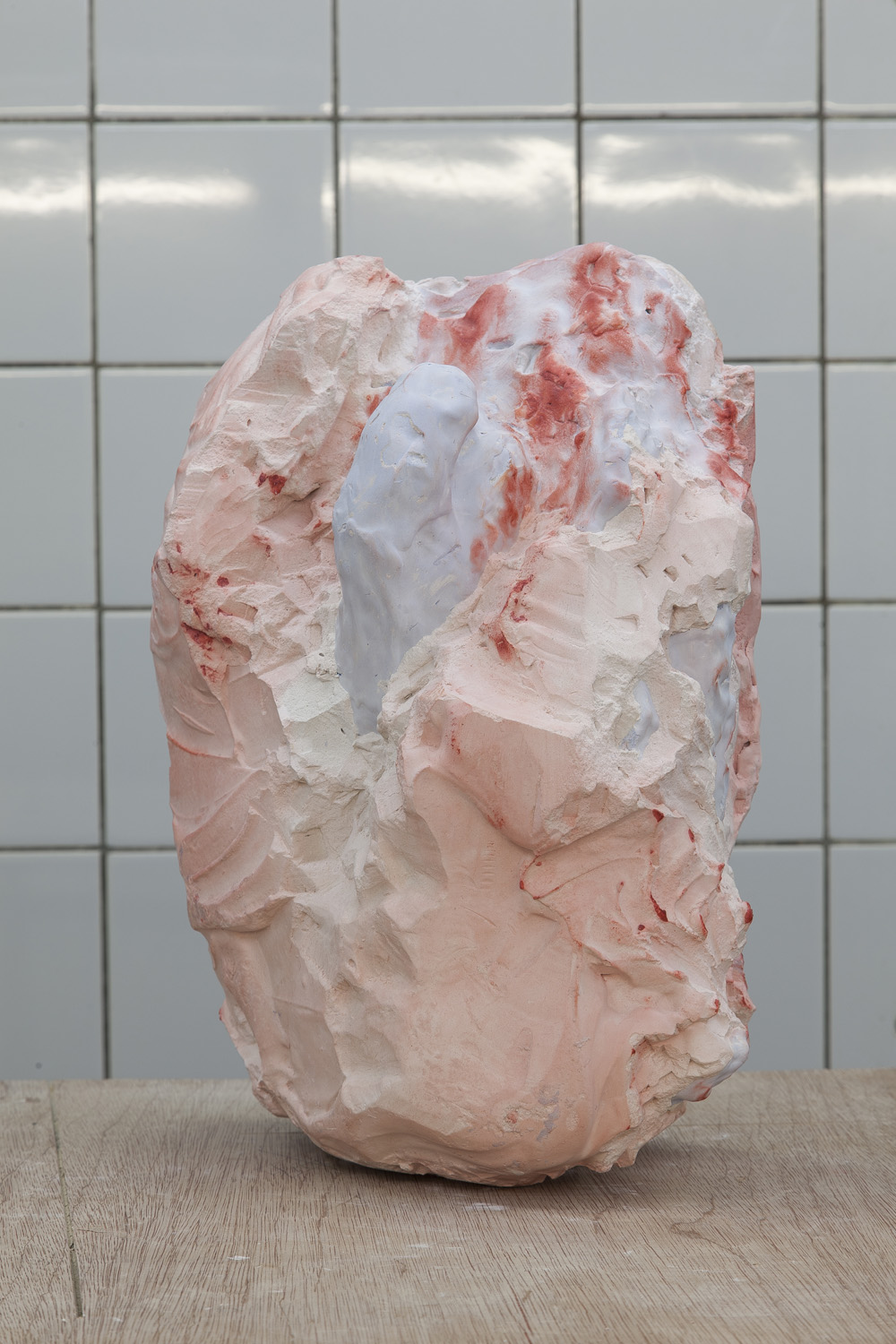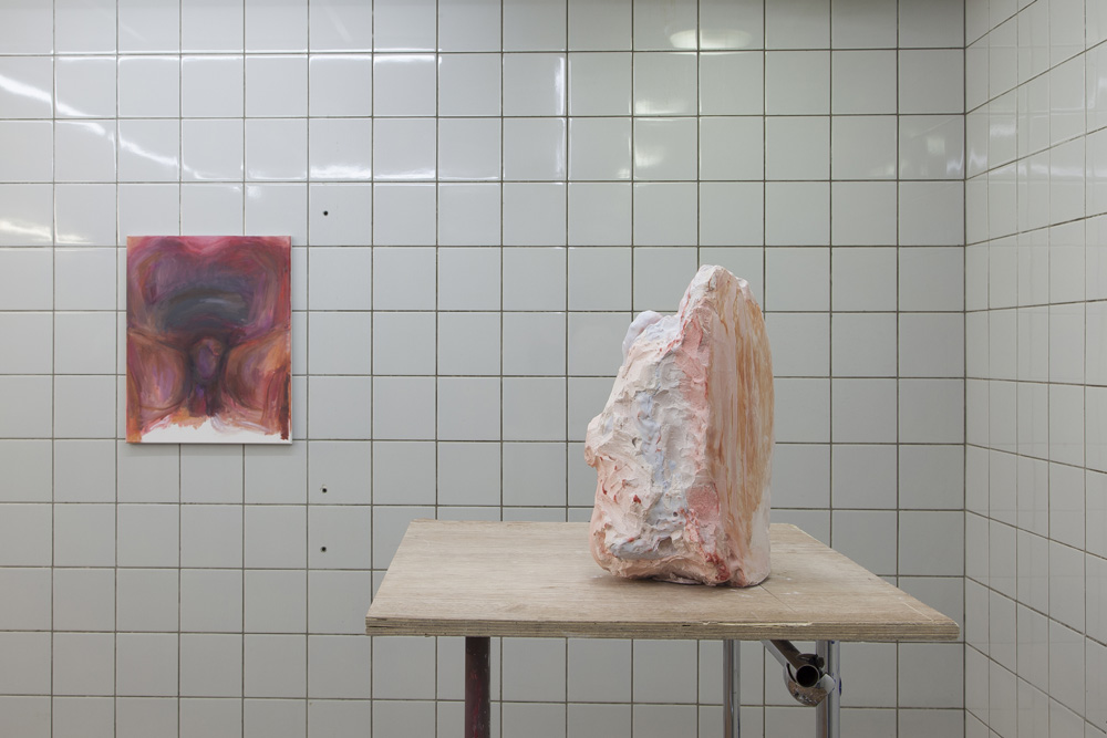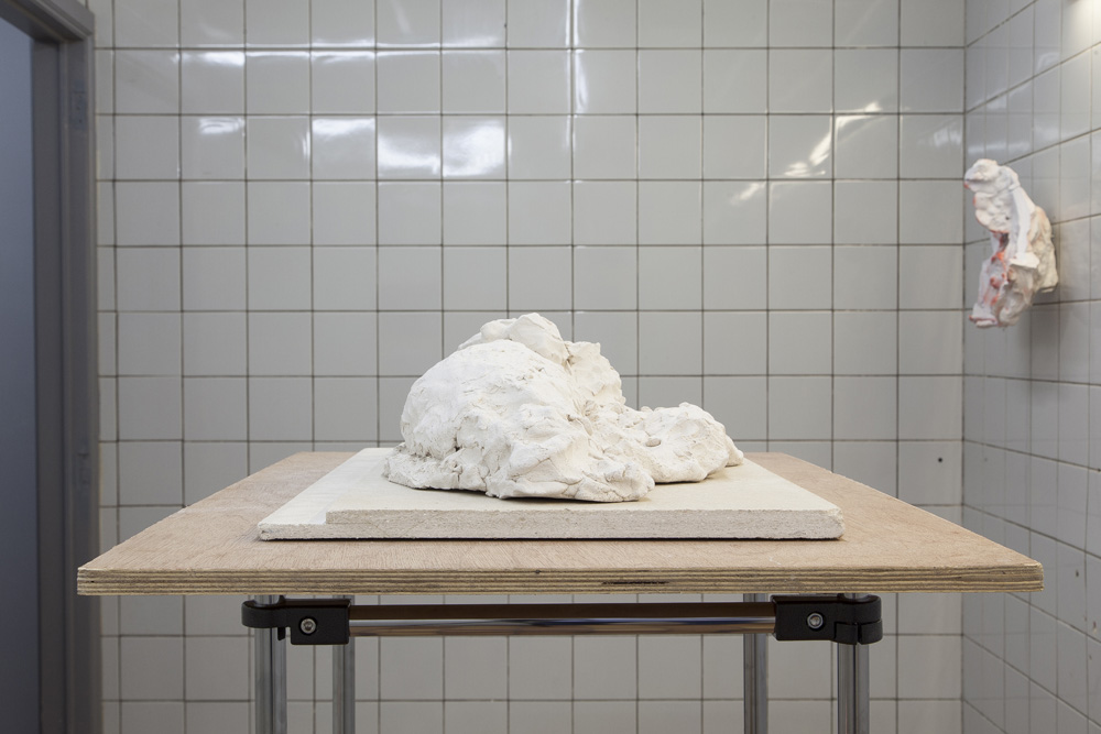 The sculptures in the exhibition start as wet clay, which is handled and shaped. At this point some clay sculptures are fired, whilst others are covered in plaster. Once the plaster sets, the clay is removed and often in this void more plaster is poured. Plaster into plaster, which is buffered by a fine powder of clay. The plaster is sometimes painted with pigmented water, which returns to the surface as a kind of blush. The cast is carefully excavated by chipping away the mold. In certain works these two forms, the interior cast and exterior mold (the protuberance and the vessel) become undifferentiated, collapsed and fused into a single form.