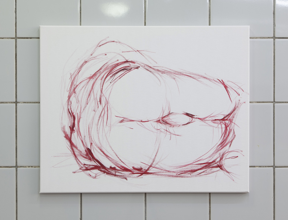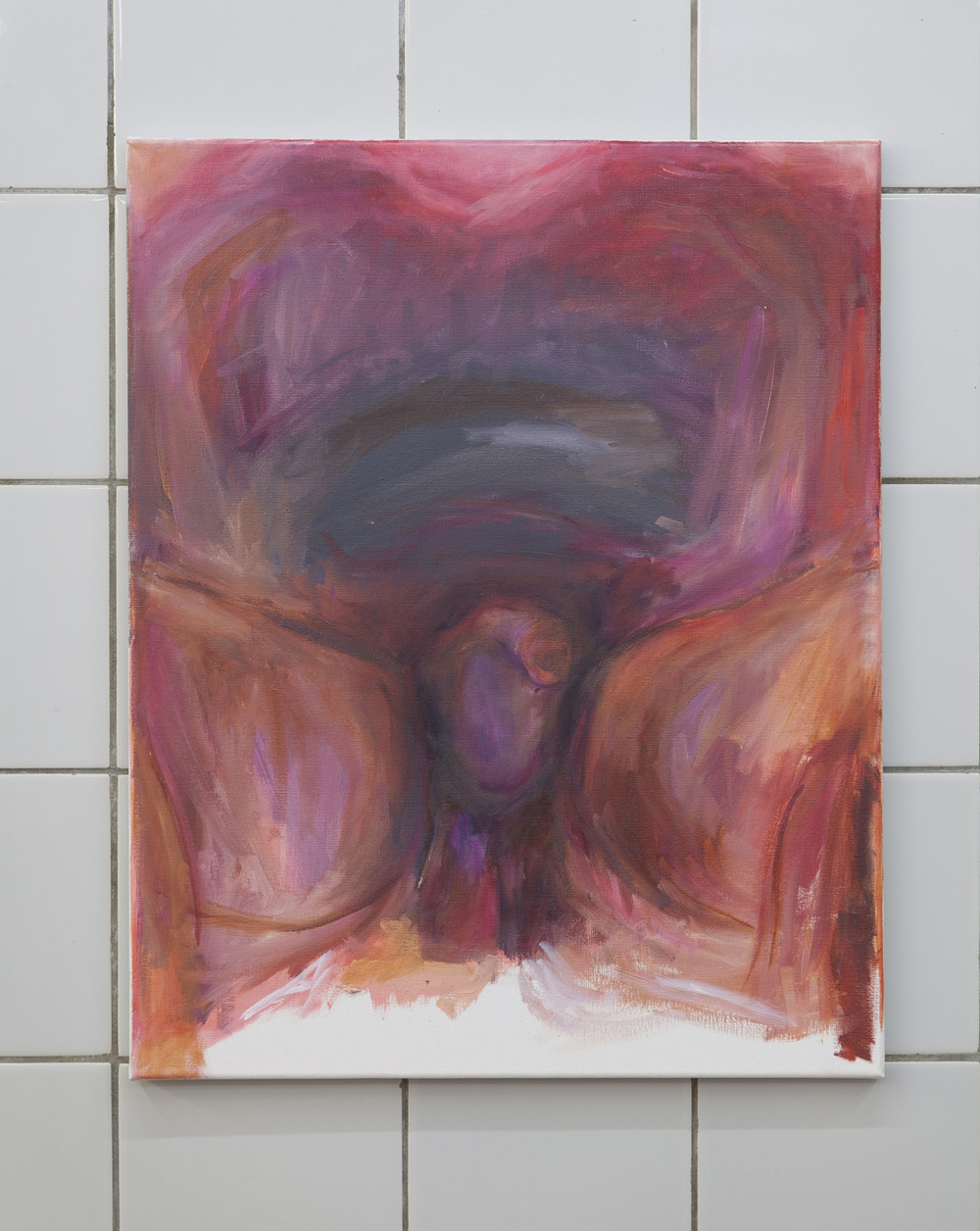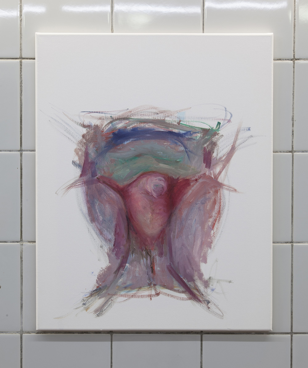 Within the paintings, the perspective is closely cropped. Painted on roughly head-sized canvases, one might wonder, from where am I looking? In some paintings the POV appears to be from below (from between the legs?), looking up at the foreshortened subject, now truncated. In certain works the crotch is articulated to a point of entropy, where layers of material or color build up into a tunnel or recess. The cock is a vehicle: both entry point and exit to the work.