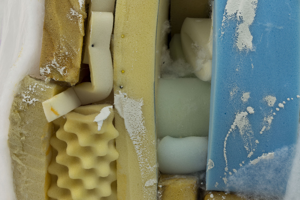 Zinaïda Tchelidze and Rachel Koolen first worked together on a project titled The Sun In Our Window (Le Sceptre, 2014). This early work, instigated by an exchange of gifts, consisted of an arrangement of found bricolage objects and materials that preserved the traces of their conversations. Four years later their collaborative practice has developed, and their approach has shifted to stress the body, labour and the construction of space. The works contrast technologies of the body (tampon viscose, clothing, food processing) with technologies of the home (construction materials, cushioning, adornment).