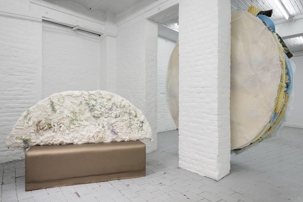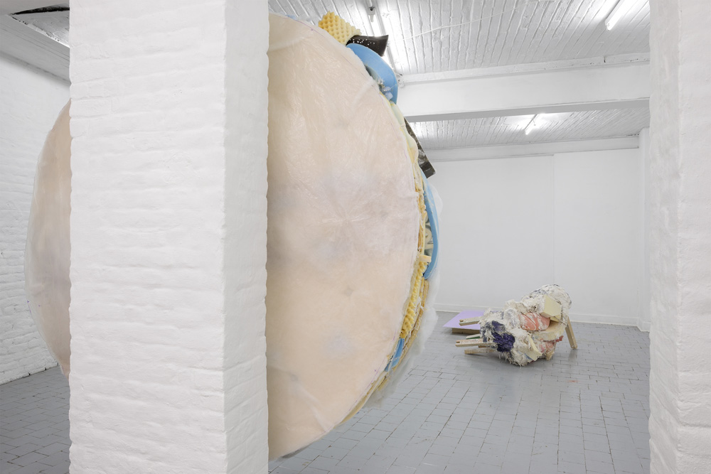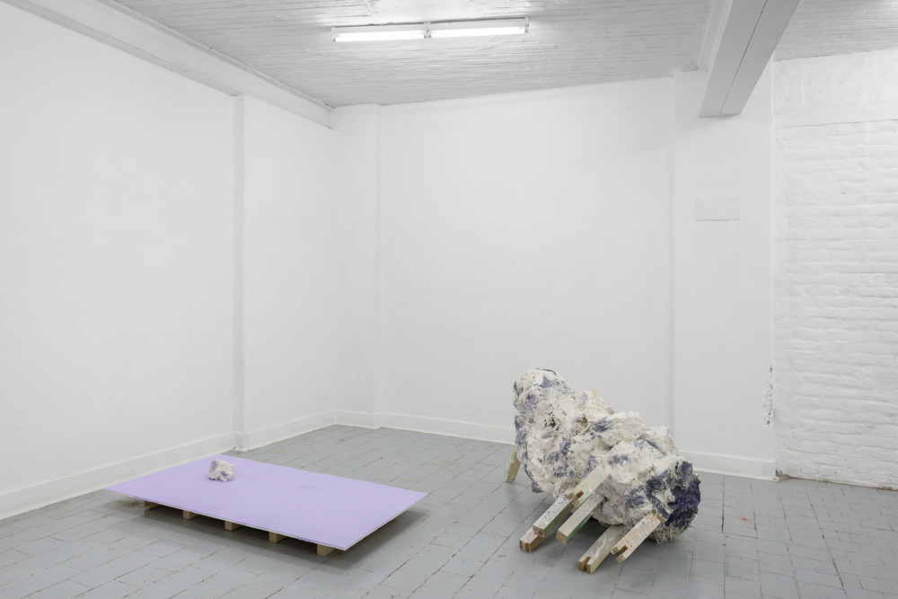 Making is a process of misremembering, forgetting, inventing new narratives to take the place of old ones. In this exhibition we have several objects that once existed as one, most likely. Things built and rebuilt; a chaotic neurotic reaction. Pink Cloud is a children’s story about a girl’s desperate attempt to remake a perfect cloud. Her furious construction continues until she forgets her original point of reference… BUT and THEN this thing exists. There is a break again−debris spinning, pieces lost. Lime was originally used to construct walls; tampon viscose to absorb fluids. The works encapsulate frantic bouts of activity paired with the slowness of curing times. They come together and are pushed apart.
