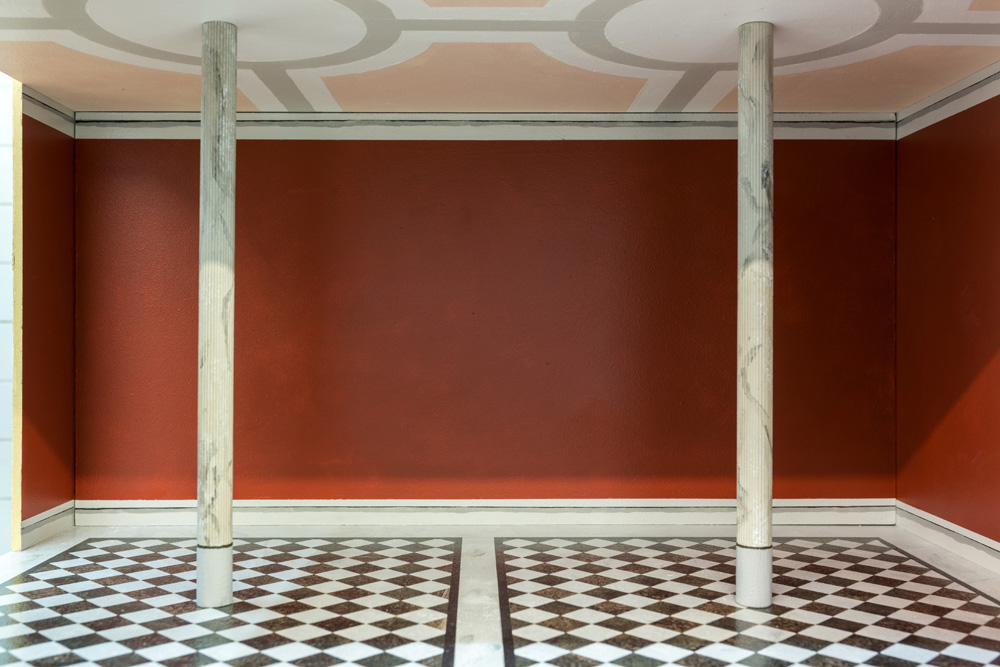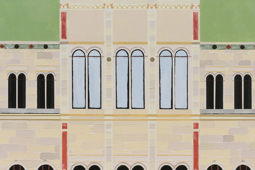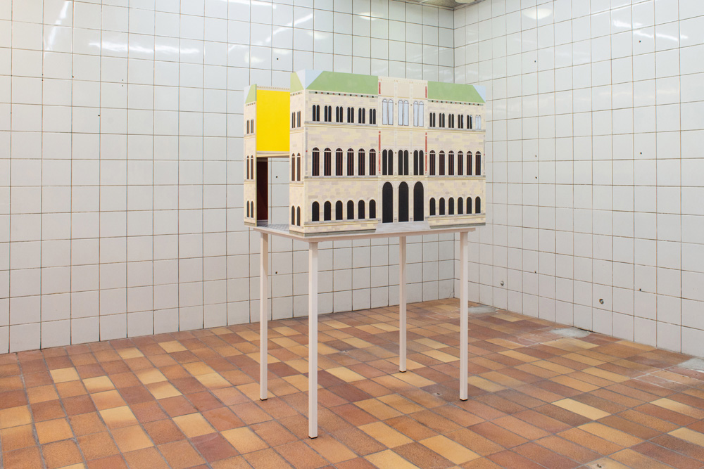 Zacharoff’s National Museum dollhouse is absent of any interior artworks or furnishings; in addition, parts of the exterior façade and roof have been removed. A series of painted planes are held together, forming the space of a museum. Light plays on detailed and finely painted surfaces. Rather than absence, there is spaciousness. The building waits for something new to arrive.