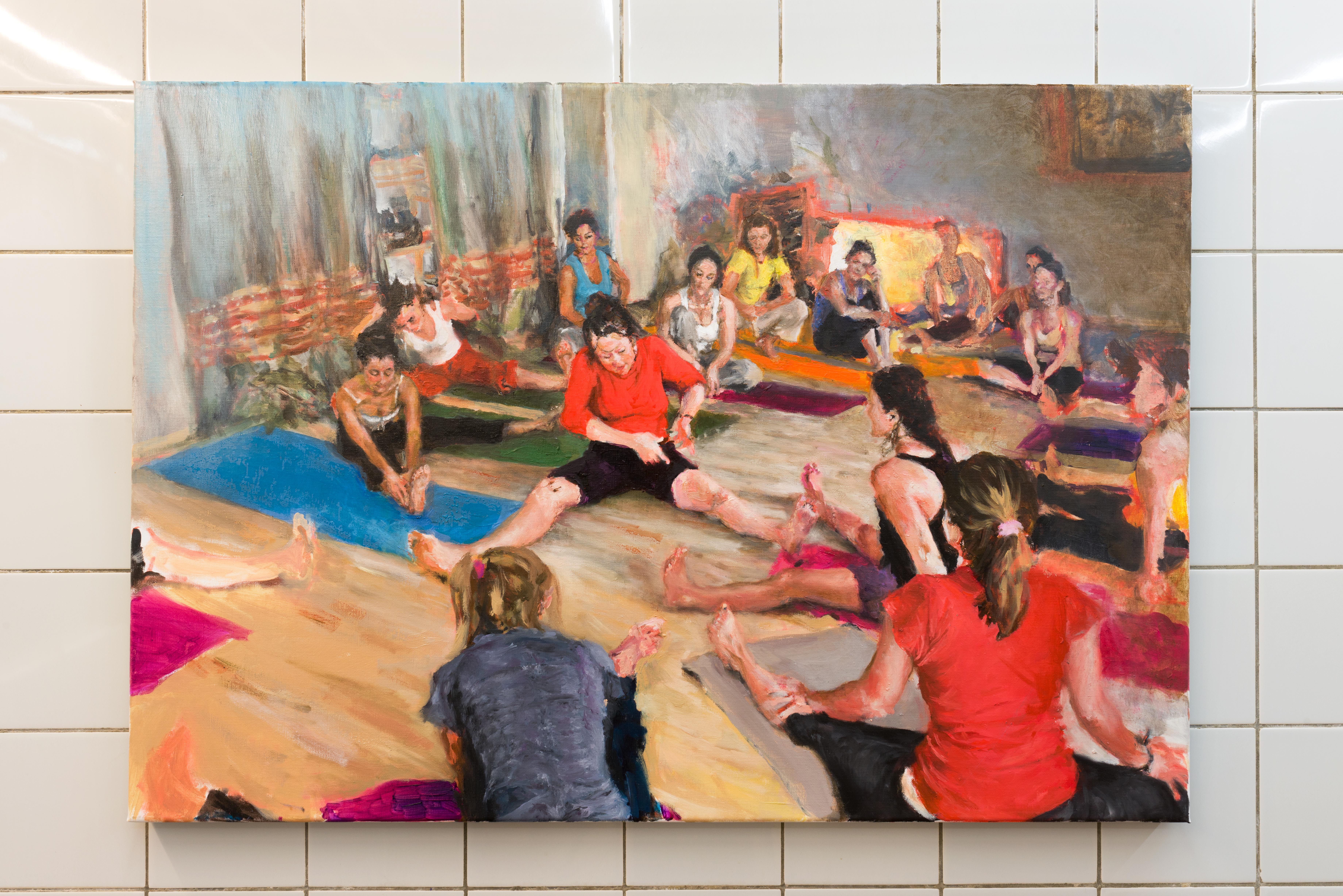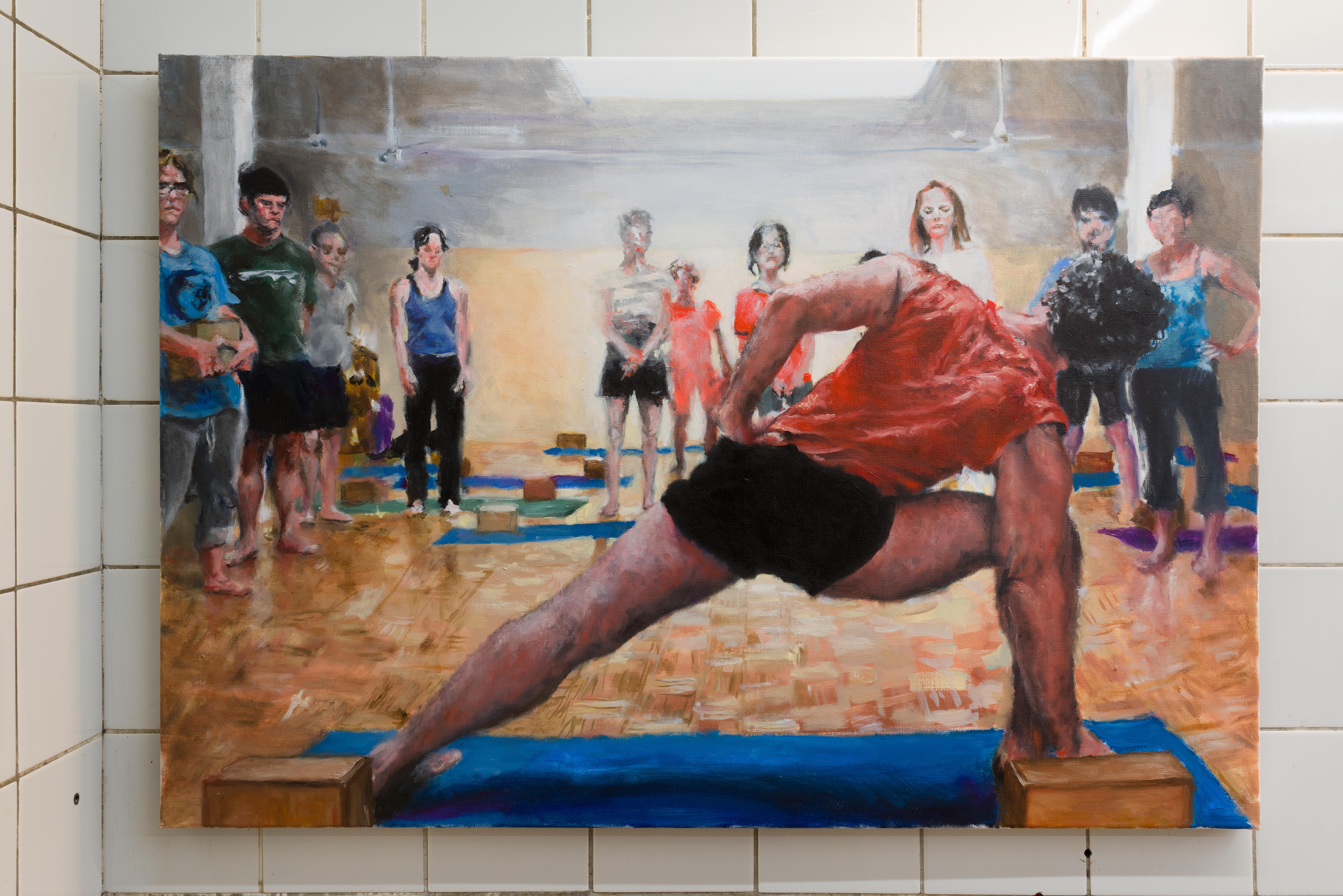 In The Placement of the Thigh by Batsheva Ross (2020) a yoga instructor sits in the centre of a fitness studio. Her lycra-covered legs, resting against the floor, are open at a ninety-degree angle towards the viewer: star-like, these limbs direct us along the surface of a sloping wooden floor. The instructor’s V-shaped leg form is echoed by some of her students, who attempt to imitate her. There are Vs that flop or spring, that shift off-kilter, that stretch elastically off the canvas or collapse into a pile of brushstrokes.