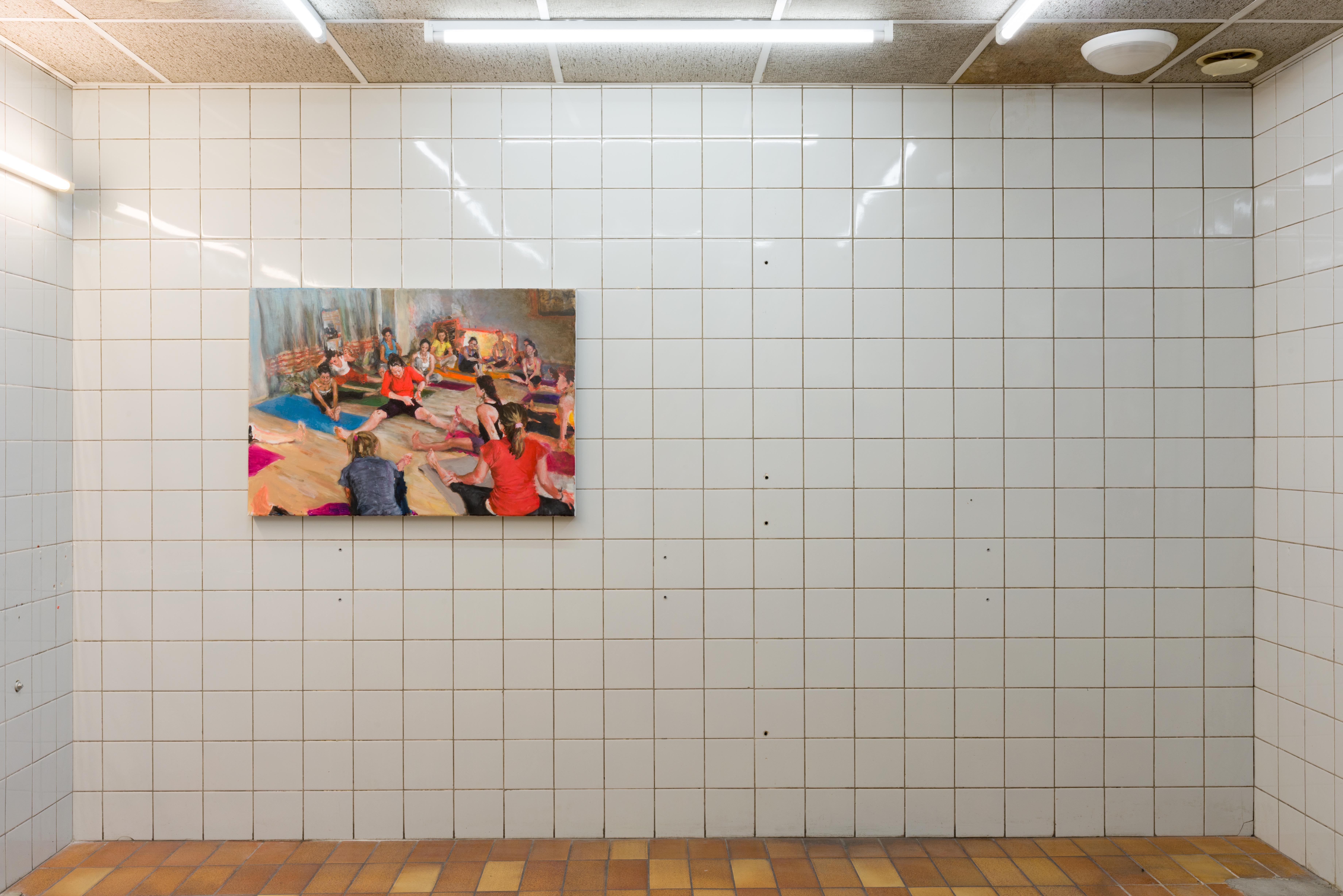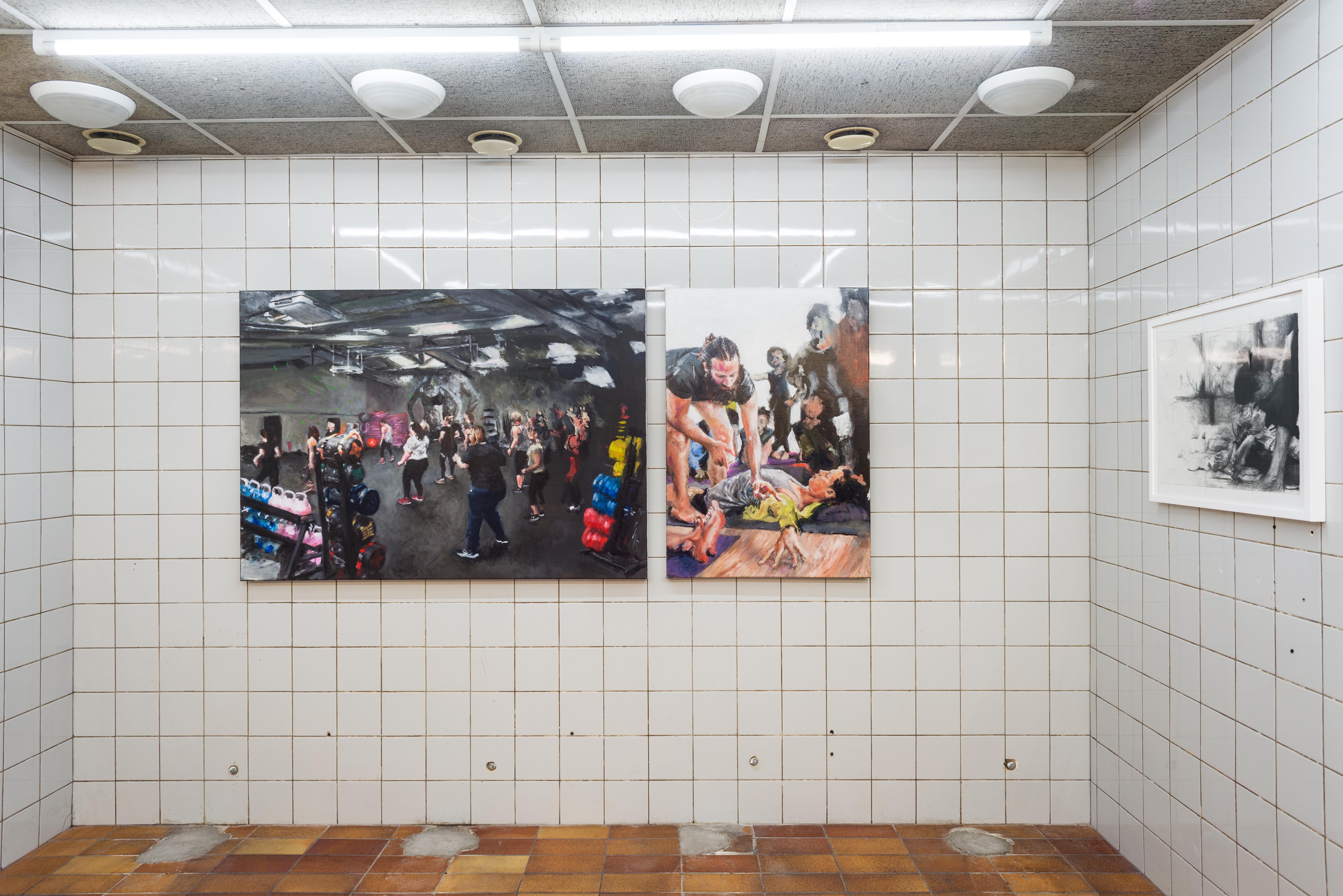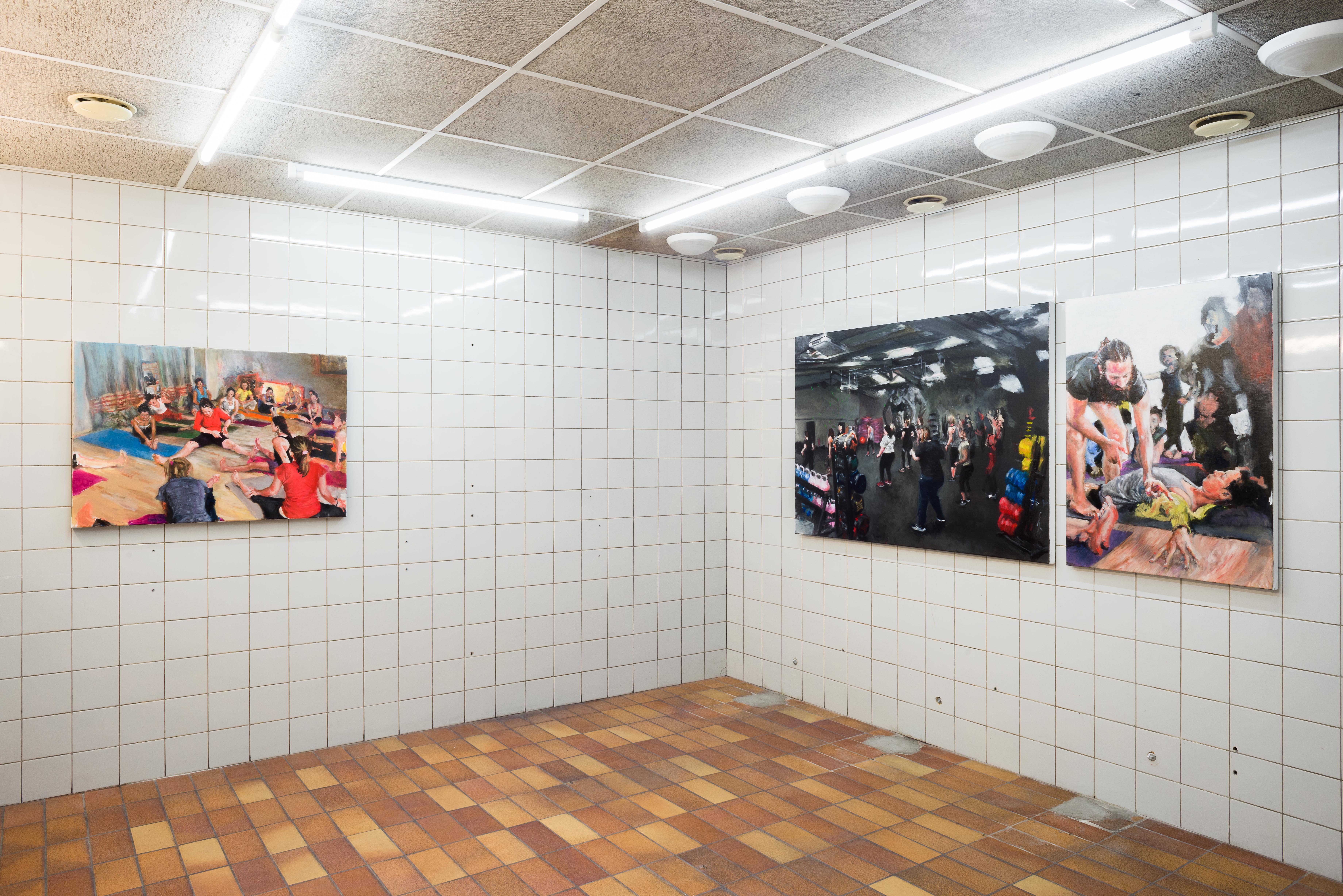Within the exhibition space of Fitness Studies, the paintings’ broken perspectives stretch and join together into a stadium or an anatomy theatre. The paintings are socialised into a group where an instructor is always present. They position us: where we look and how we move.