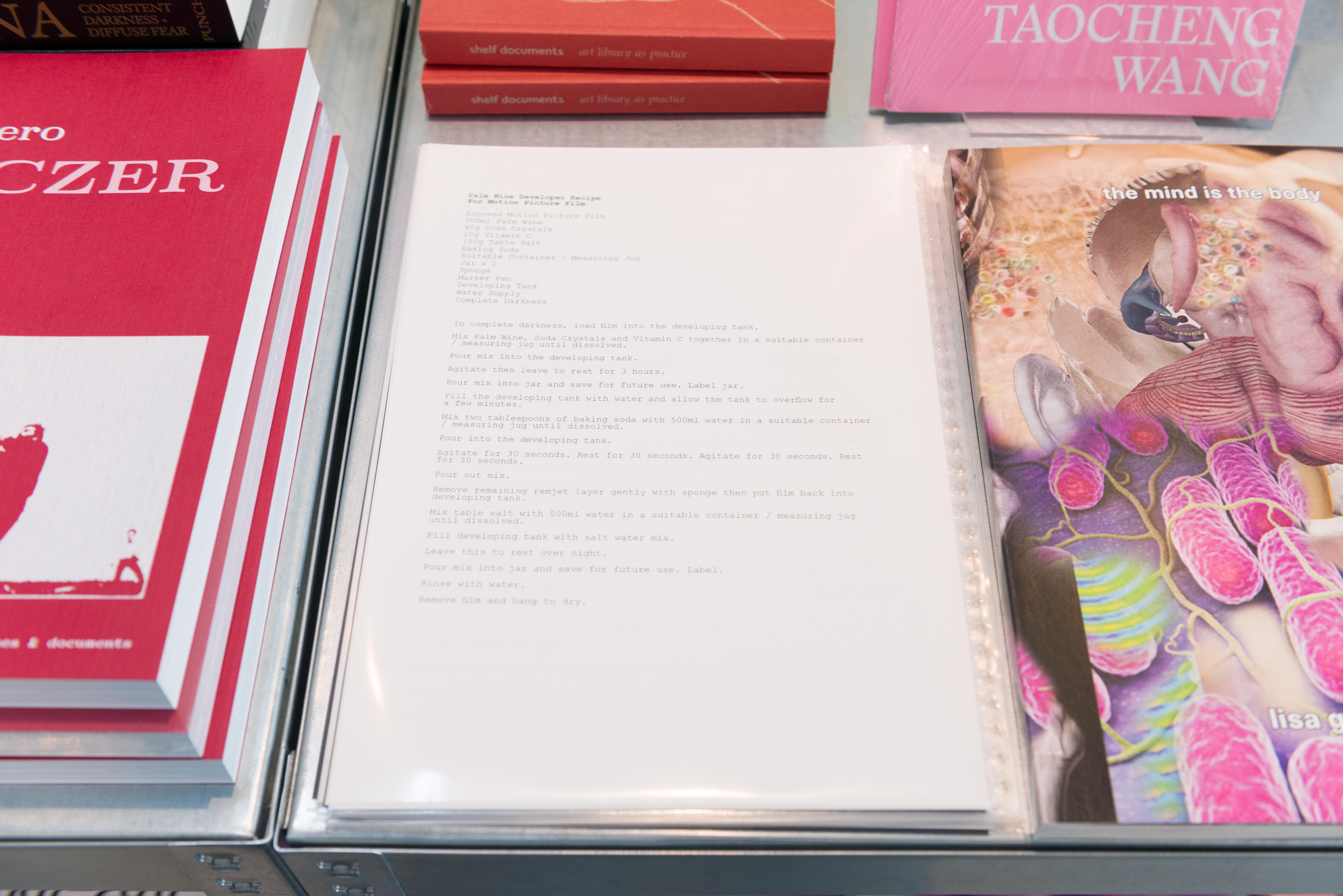 The title of the exhibition Abe bi rebewu a na ɛsɔ is a Ghanian proverb meaning ‘it is when some palm trees are about to die that they give good wine.’ Palm wine, a ritual drink in West African countries, is taken up by Adi as the main ingredient within a homespun film developer recipe. It appears in the exhibition as a publication Palm Wine Developer Recipe for Motion Picture Film, (2022) which contains Adi’s uniquely formulated recipe translated into the three main languages spoken in Brussels: French, Dutch and English. The publication is available for sale, offsite, at rile* books, and also as a PDF on our website. Additionally, the palm wine developer was used to produce a small film negative held within another matchbook-sized work, Whiskey (2022).