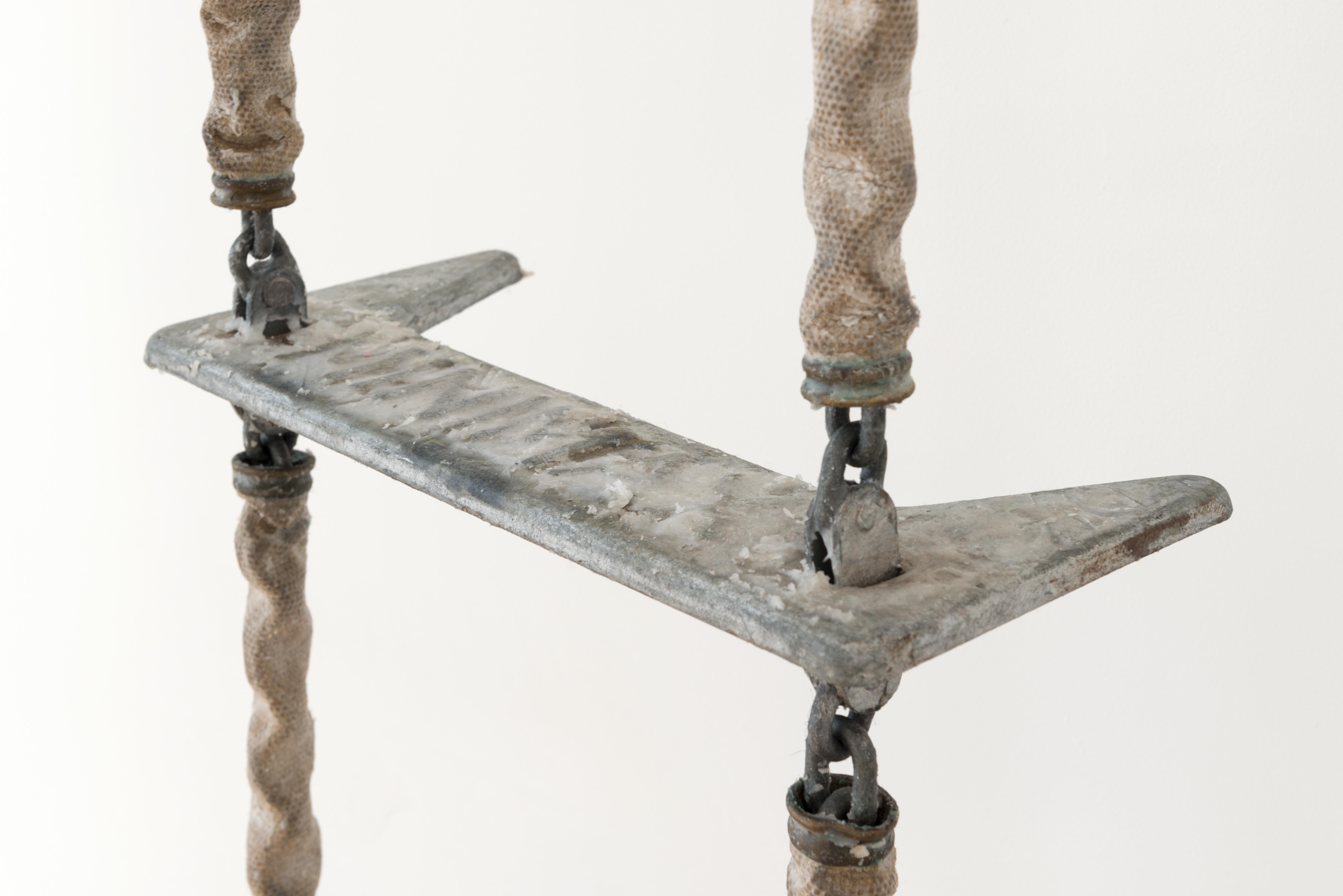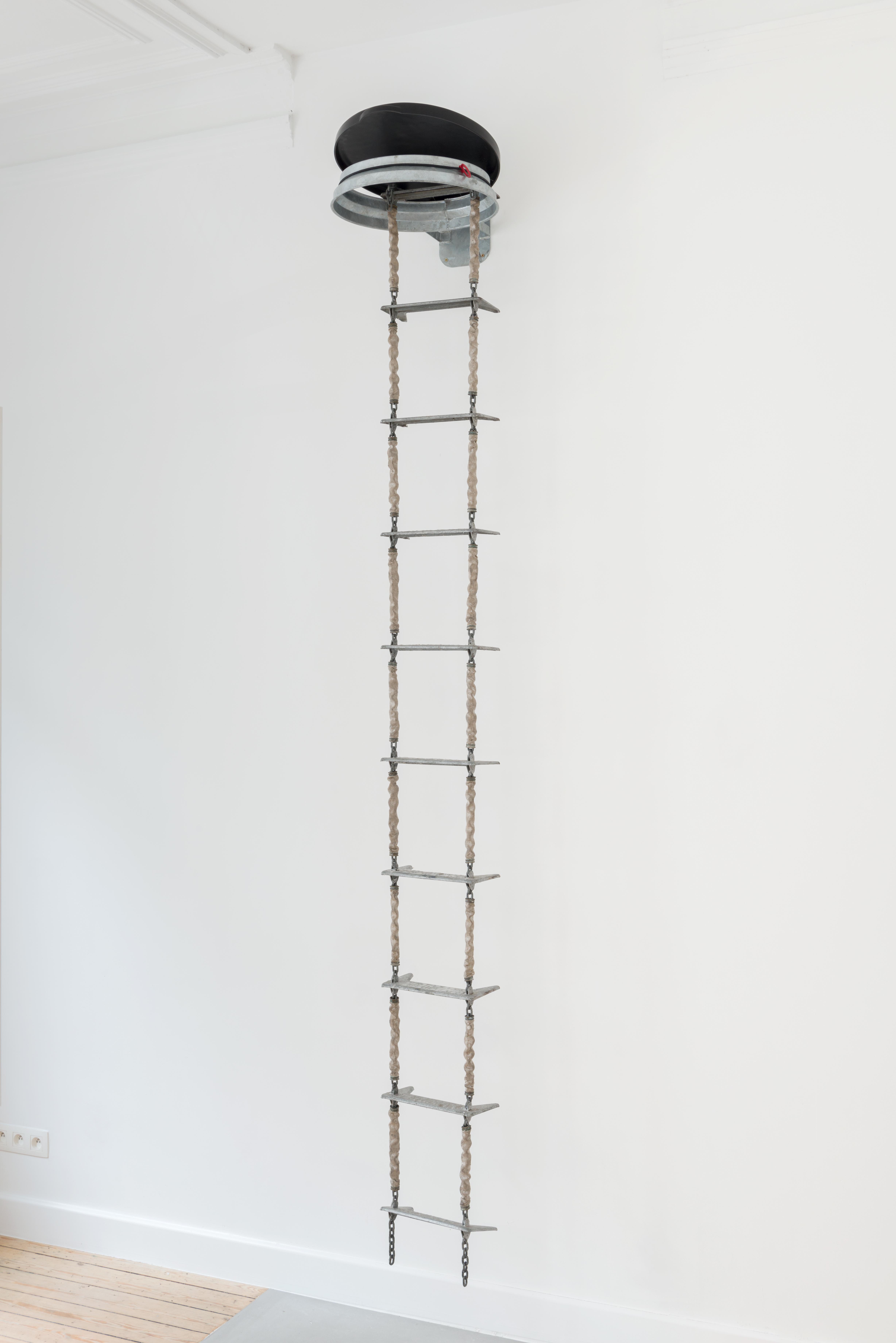 No title (2019-2020), an elongated wall-mounted sculpture, occupies the space of a former fireplace. The work is composed of an emergency escape ladder covered in aqueous cream that dangles from the lid of a garbage sack holder.