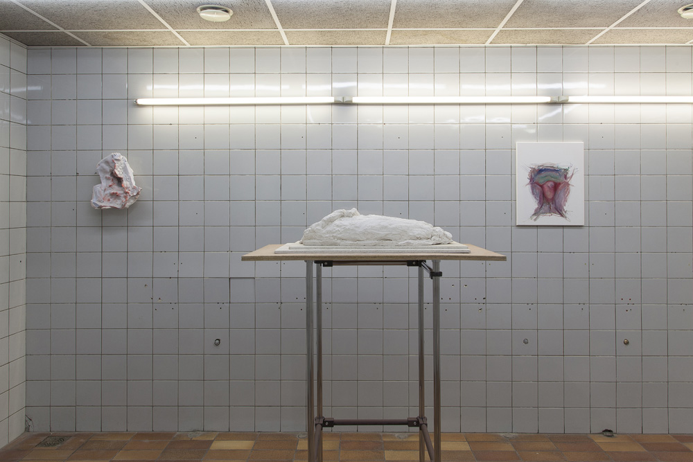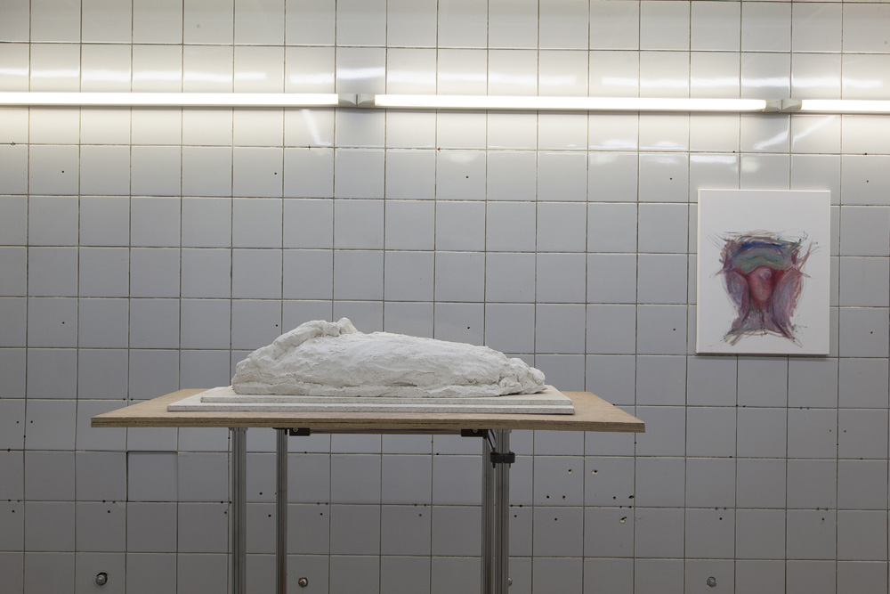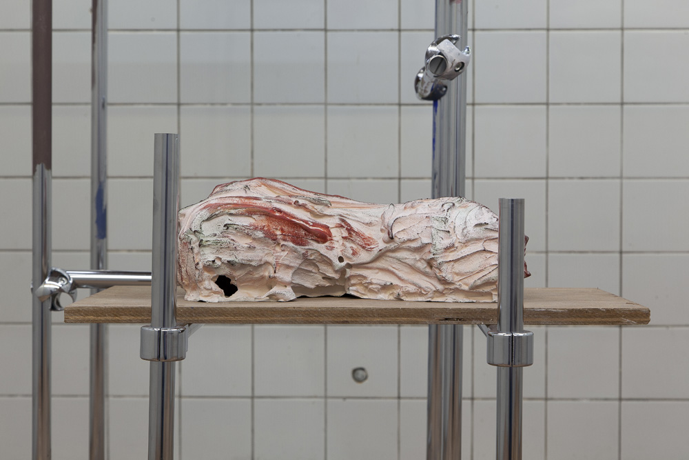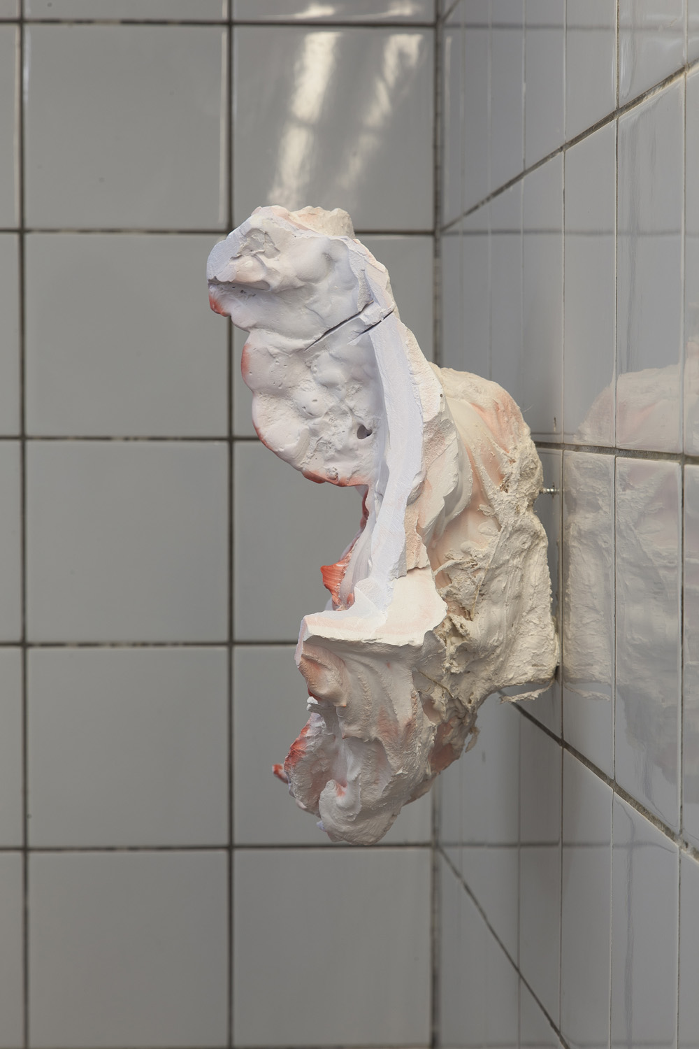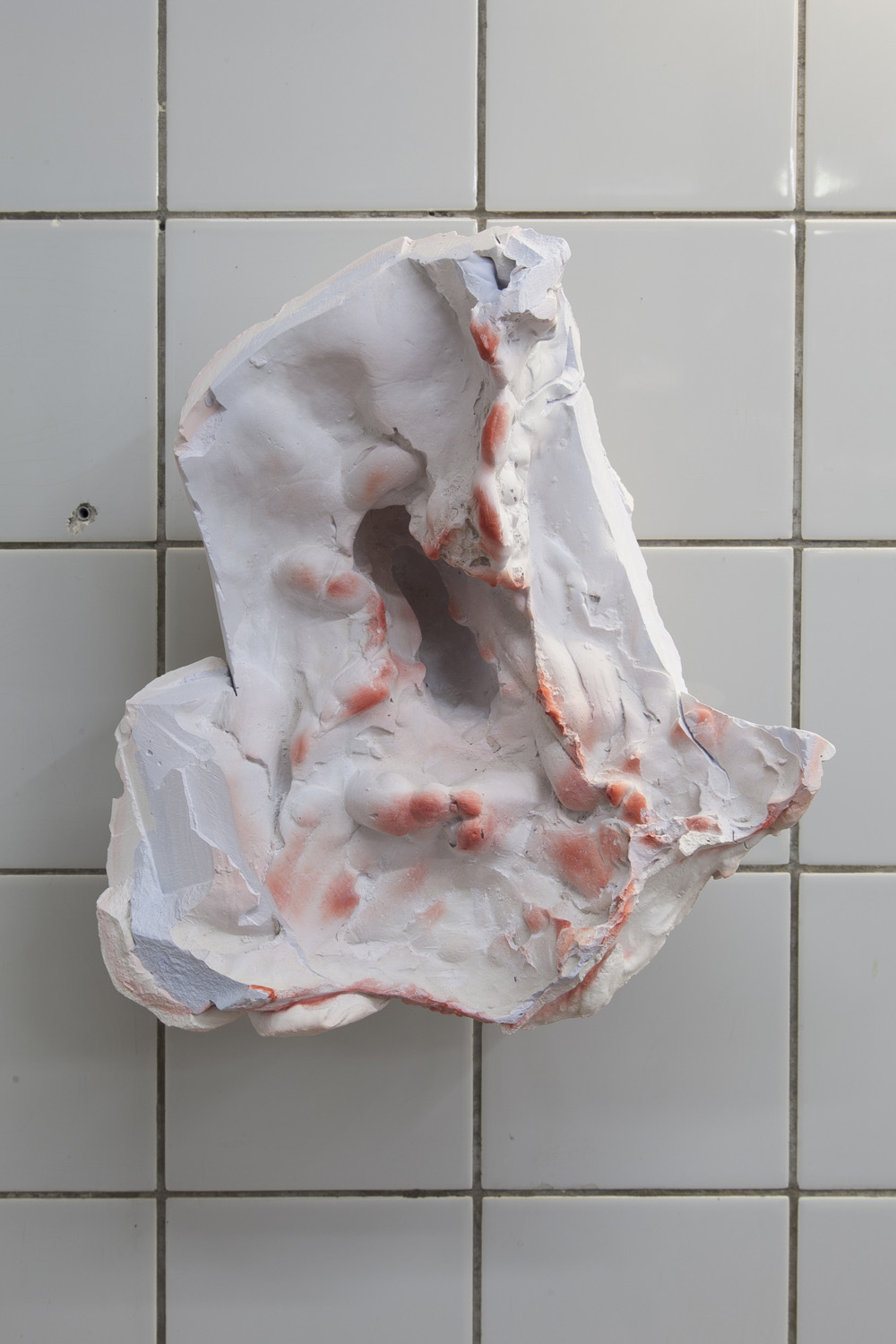 The sculptures in the exhibition start as wet clay, which is handled and shaped. At this point some clay sculptures are fired, whilst others are covered in plaster. Once the plaster sets, the clay is removed and often in this void more plaster is poured. Plaster into plaster, which is buffered by a fine powder of clay. The plaster is sometimes painted with pigmented water, which returns to the surface as a kind of blush. The cast is carefully excavated by chipping away the mold. In certain works these two forms, the interior cast and exterior mold (the protuberance and the vessel) become undifferentiated, collapsed and fused into a single form.
