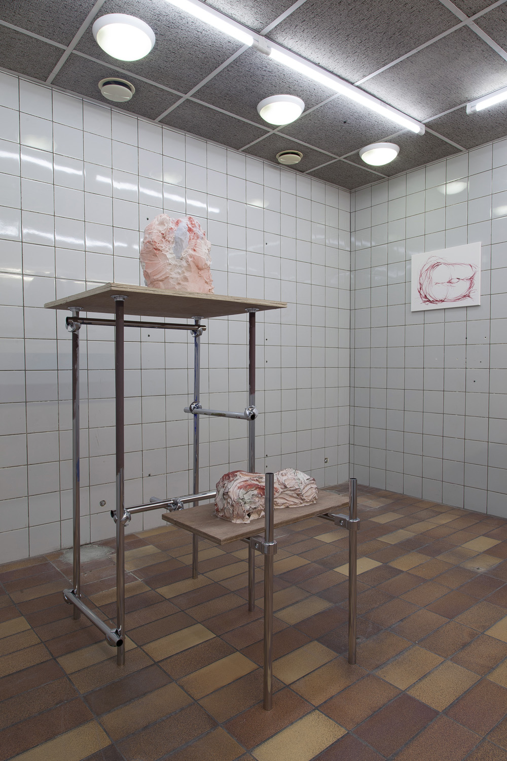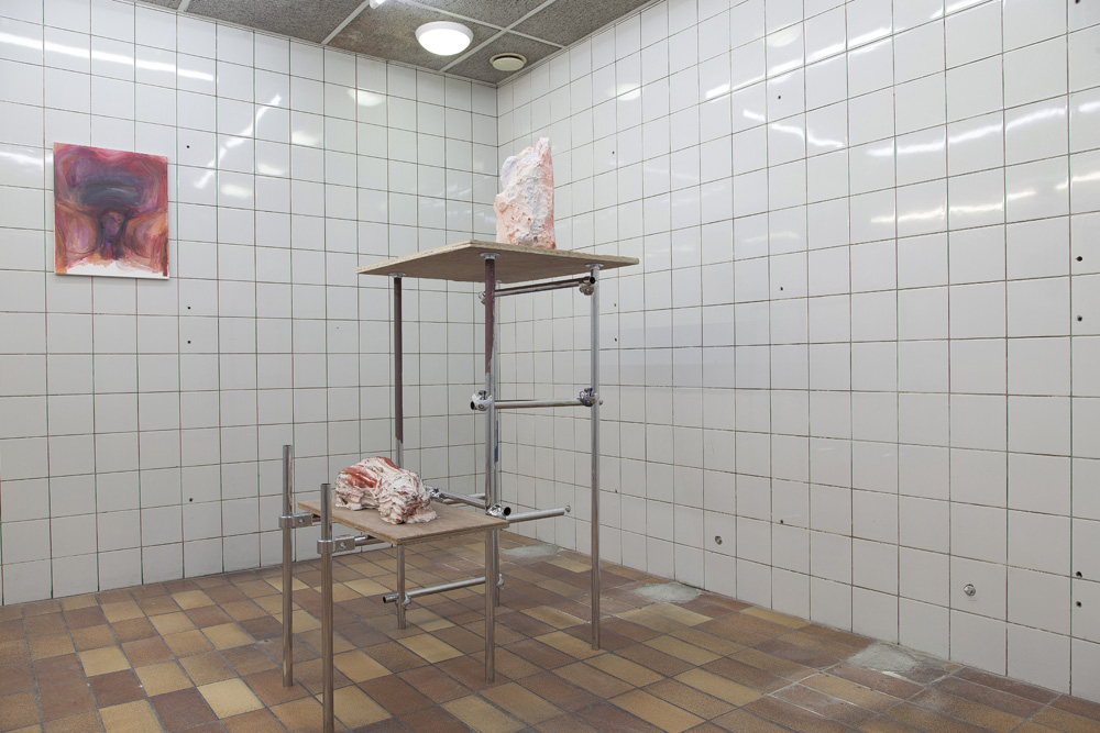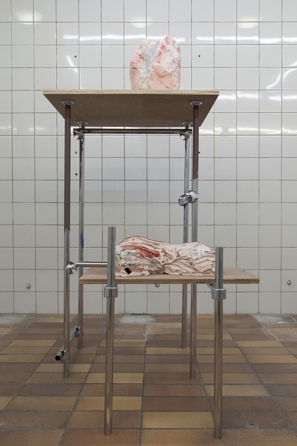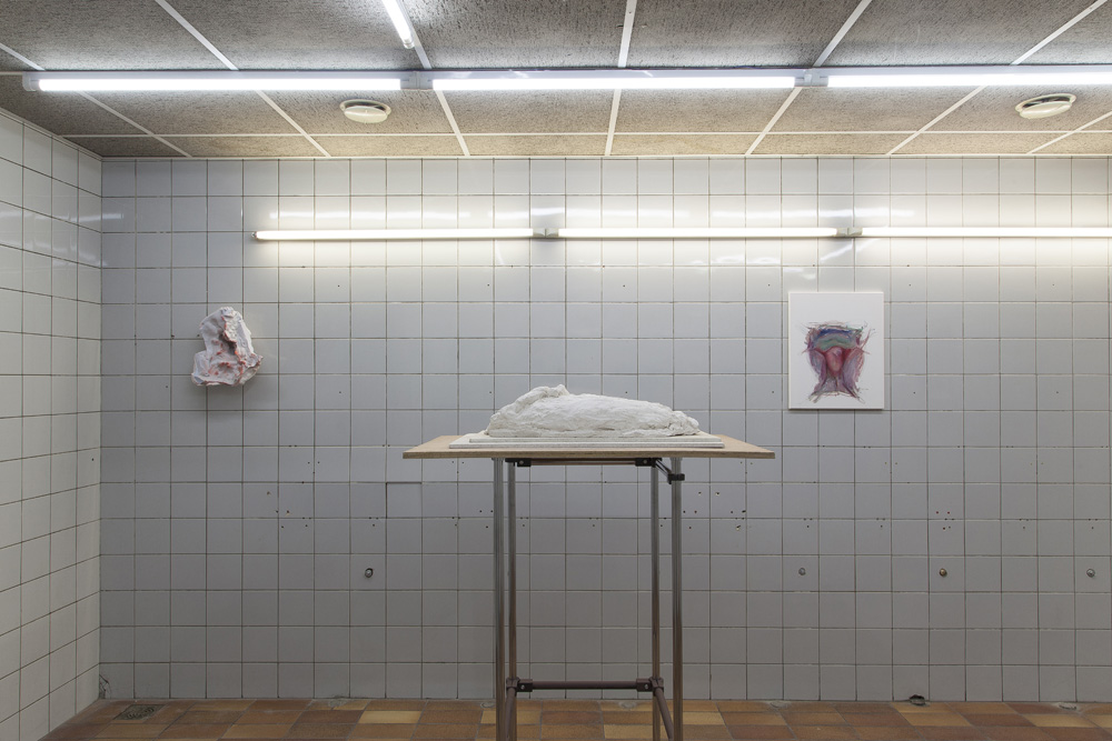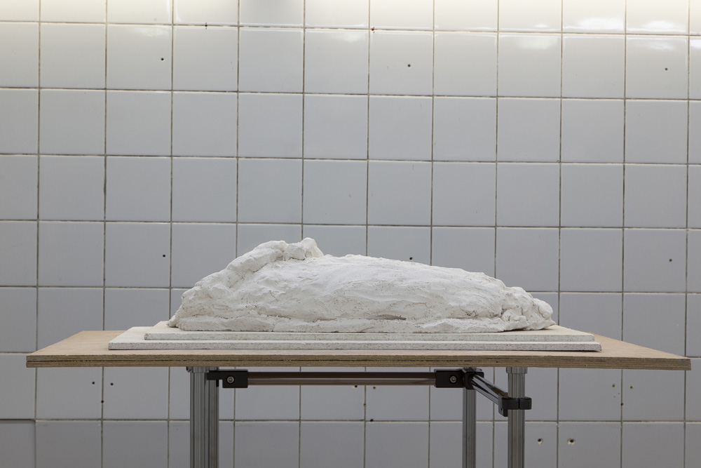 The sculptures in the exhibition start as wet clay, which is handled and shaped. At this point some clay sculptures are fired, whilst others are covered in plaster. Once the plaster sets, the clay is removed and often in this void more plaster is poured. Plaster into plaster, which is buffered by a fine powder of clay. The plaster is sometimes painted with pigmented water, which returns to the surface as a kind of blush. The cast is carefully excavated by chipping away the mold. In certain works these two forms, the interior cast and exterior mold (the protuberance and the vessel) become undifferentiated, collapsed and fused into a single form.