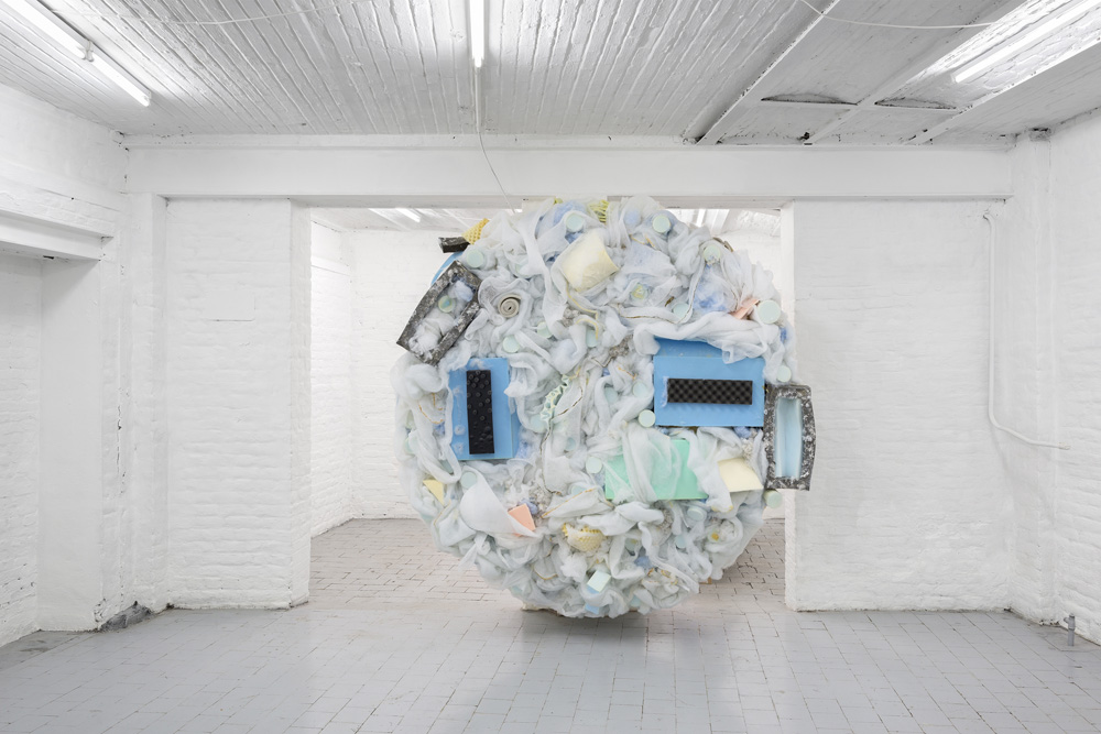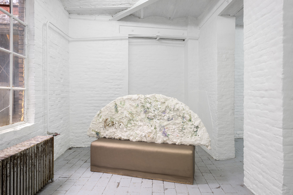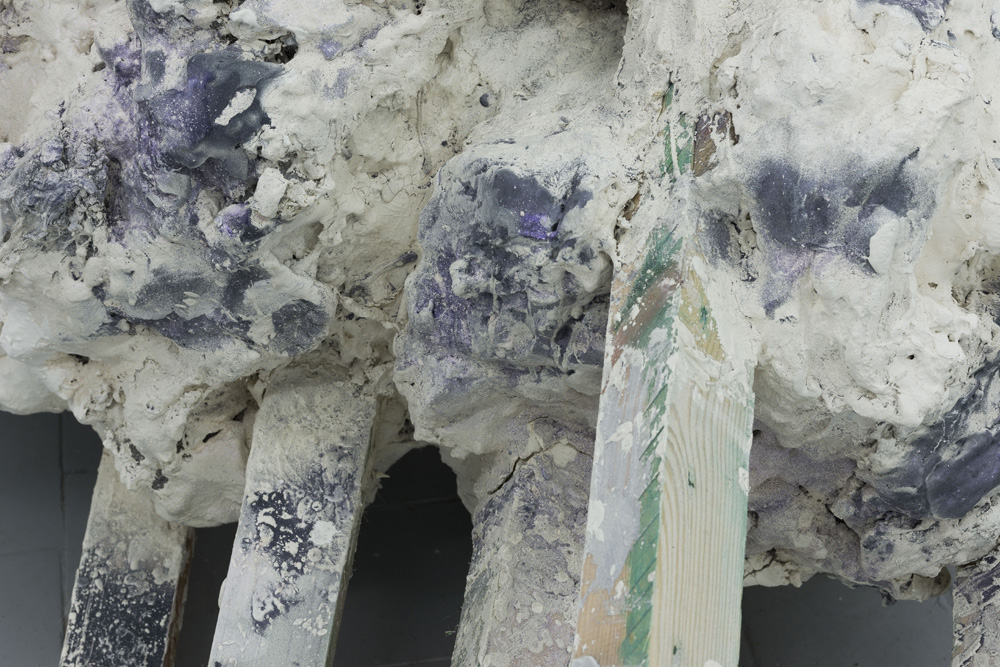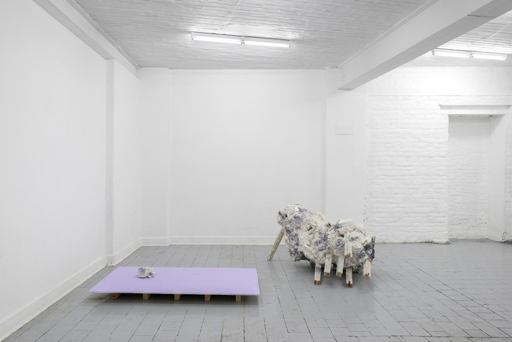 Making is a process of misremembering, forgetting, inventing new narratives to take the place of old ones. In this exhibition we have several objects that once existed as one, most likely. Things built and rebuilt; a chaotic neurotic reaction. Pink Cloud is a children’s story about a girl’s desperate attempt to remake a perfect cloud. Her furious construction continues until she forgets her original point of reference… BUT and THEN this thing exists. There is a break again−debris spinning, pieces lost. Lime was originally used to construct walls; tampon viscose to absorb fluids. The works encapsulate frantic bouts of activity paired with the slowness of curing times. They come together and are pushed apart.